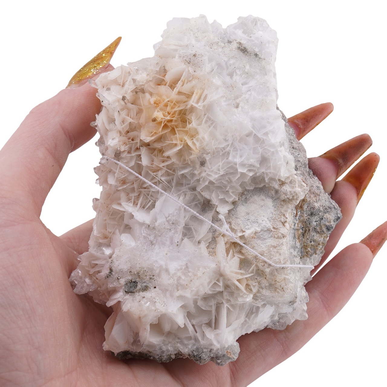Piatra este realizată integral din cristal natural, 100%, fără prelucrări care să-i schimbe aspectul autentic. Contrastul dintre strălucirea calmă a cuartului și aripile satinate de baritină creează o prezență vizuală plăcută, ușor de integrat în orice colț al casei. În mâini, simți o piesă solidă, cu un format compact de aproximativ 9 × 7 cm și o greutate în jur de 215 g, potrivită pentru a sta stabil pe un raft, birou sau în vitrina ta dedicată pietrelor semiprețioase.