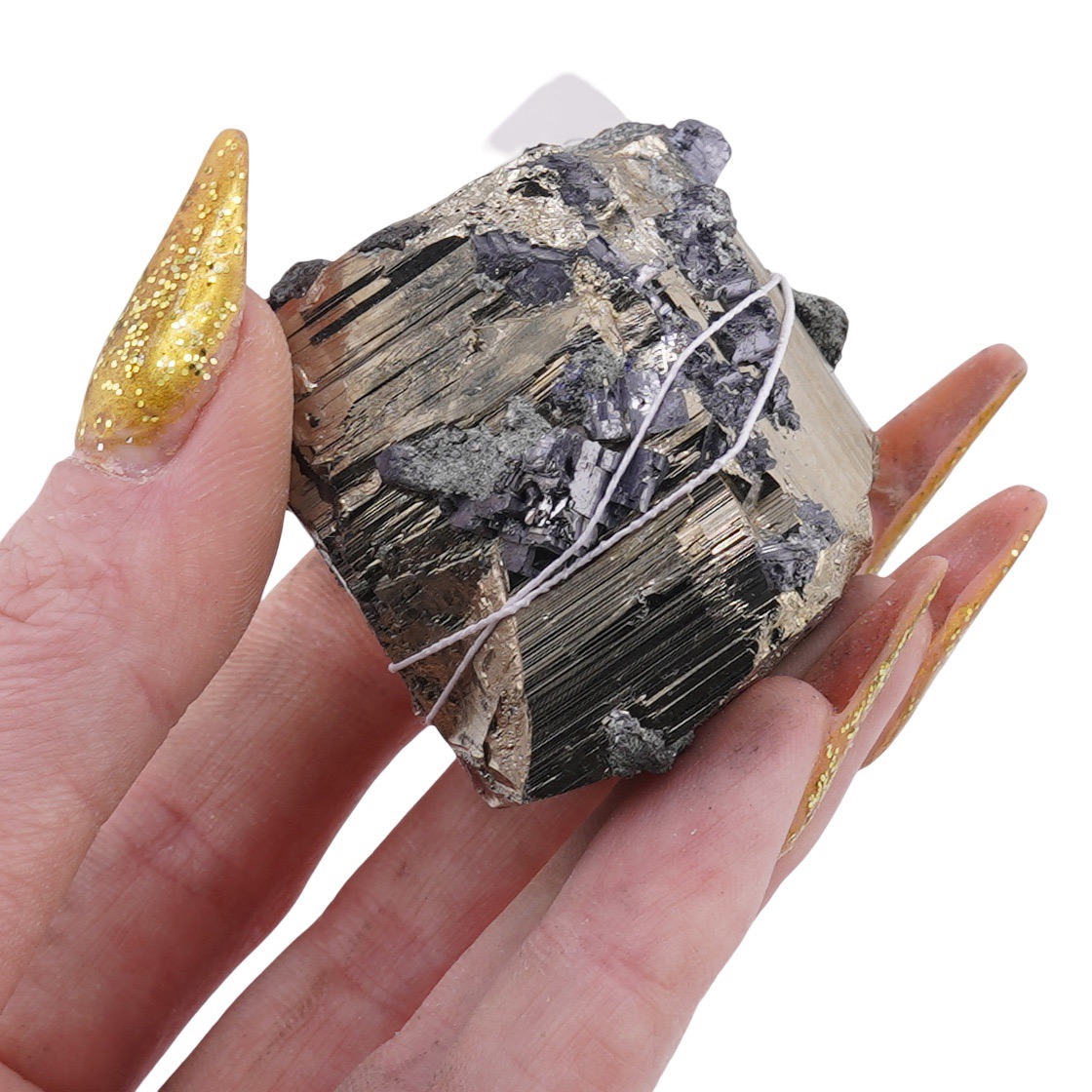 Dimensiunile sale compacte, de aproximativ 4 cm x 3,5 cm, o fac ușor de integrat pe o etajeră, într-o vitrină sau pe birou, iar greutatea de 165 g îi oferă stabilitate. În lumină naturală, pirita capătă o strălucire discretă, în timp ce sfaleritul aduce contraste elegante, accentuând personalitatea cristalului.