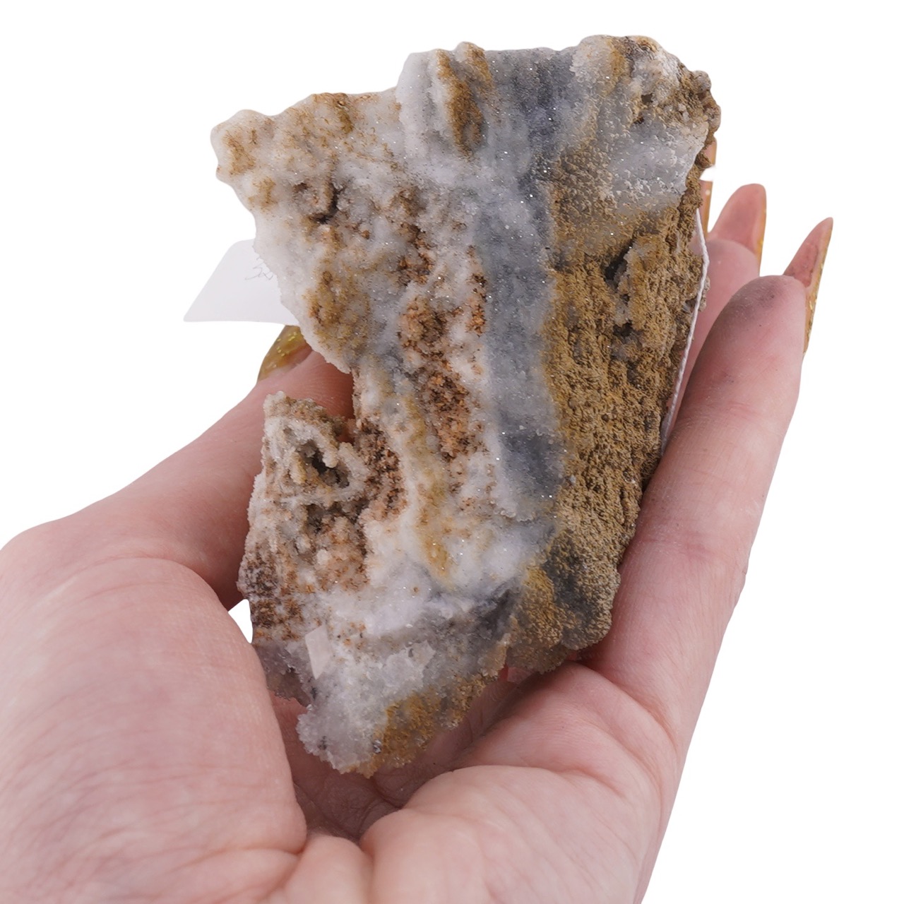 Îngrijirea este facilă: șterge ușor praful cu o perie moale sau o cârpă uscată și așază piesa într-un loc ferit de umezeală prelungită. Astfel, păstrezi aspectul proaspăt al cuartului druzos și patina naturală a limonitului, menținând farmecul mineral al piesei pentru mult timp.