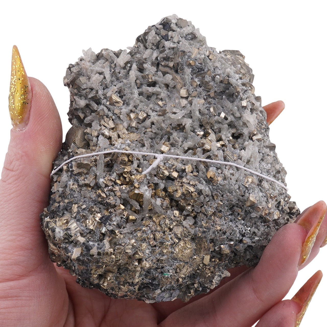 Fiind 100% cristal natural, fără adaosuri sau tratamente, piesa păstrează aspectul autentic al zăcământului din care provine. Are aproximativ 8,5 × 7,5 cm și o greutate de 387 g, dimensiuni care îi oferă stabilitate și o prezență plăcută pe o etajeră, într-o vitrină sau pe birou. Datorită combinației de cuarț, pirită și sfalerit, suprafața captează lumina în moduri diferite, de la sclipiri discrete la reflexii metalice.