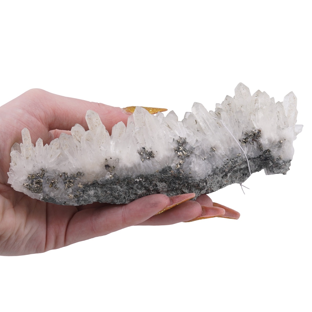 Profilul alungit o face ușor de integrat în vitrină sau pe birou: are aproximativ 15 x 5 cm și o masă de 324 g, suficient de stabilă pentru a sta pe un suport simplu. Privită îndeaproape, se observă aranjamentul natural al cristalelor de cuart, ca niște petale, în timp ce punctele de pirită adaugă profunzime și ritm vizual. Este o piesă care spune o poveste geologică clară, fără a căuta efecte spectaculoase, ci mizând pe autenticitatea materialului.