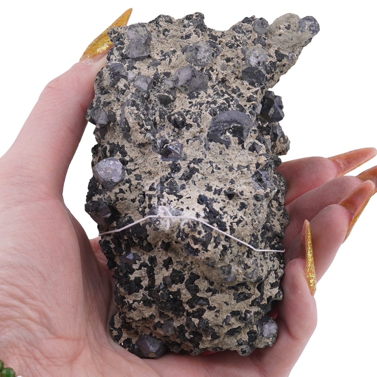 Cu aproximativ 10 × 6 cm și o greutate de circa 491 g, cristalul are un format comod pentru expunere, fie pe birou, fie într-o vitrină dedicată. Este realizat exclusiv din cristal natural, fără adaosuri, astfel încât să păstreze fidel povestea geologică a locului din care provine. În lumină difuză, suprafețele minerale dezvăluie detalii interesante: reflexe discrete ale sfaleritului, muchii ferme de galenă și pelicule verzi de clorit care dau volum și profunzime compoziției.