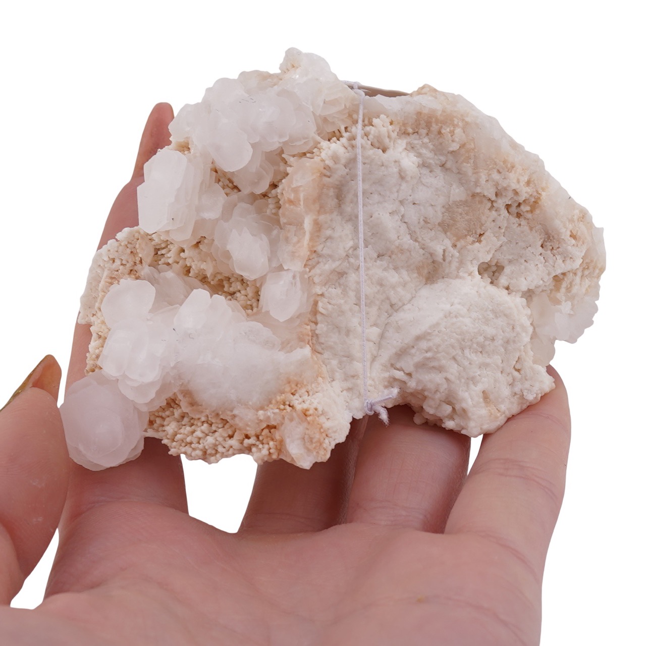 Fiind un cristal natural cu structură poroasă, se recomandă manipularea cu grijă. Curăță ușor cu o pensulă moale sau aer suflat, evită umezeala prelungită și așază piesa pe un suport stabil. Astfel, vei păstra integritatea calcitului poros și a micilor reliefuri de dolomit care îi conturează forma.