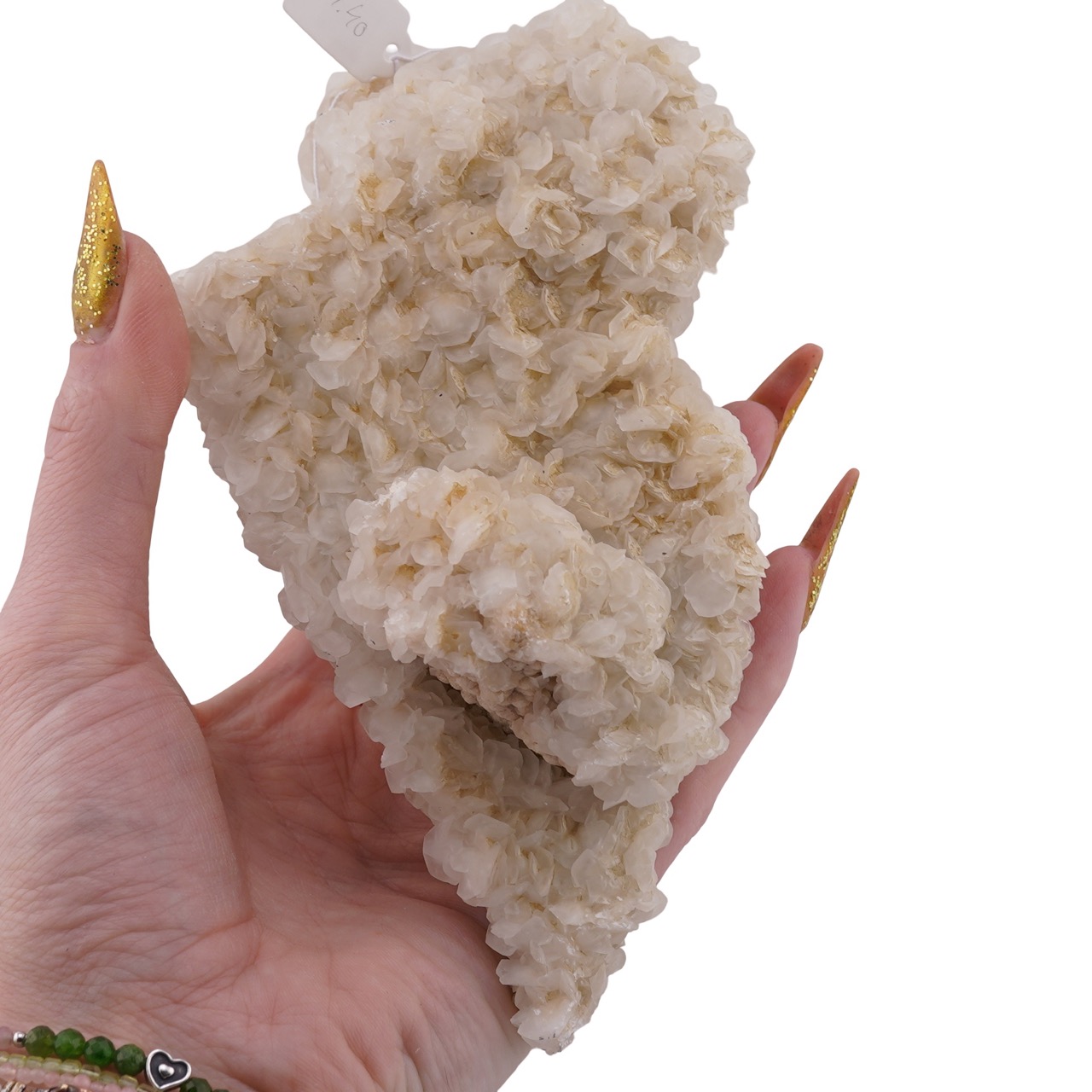 Originea din Bulgaria contribuie la caracterul său vizual, recunoscut de pasionați pentru combinația de stilbit și calcit poros. Fiind format exclusiv din cristal natural, micile variații de culoare și textură sunt normale și dau autenticitate piesei. Pentru îngrijire, este suficient să îndepărtezi praful cu o pensulă moale sau o lavetă uscată și să eviți contactul direct și prelungit cu apa, mai ales pe zonele poroase.