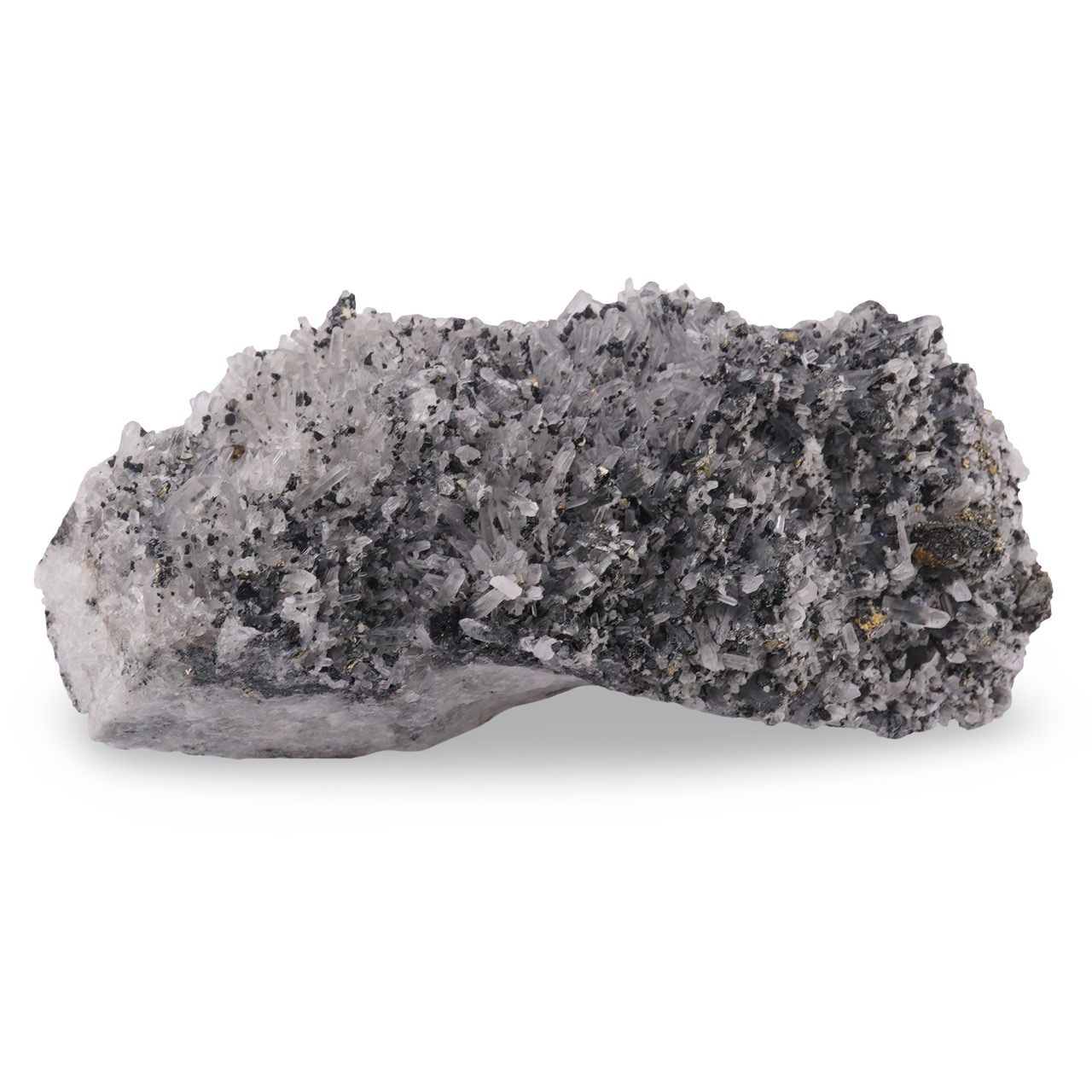 Structura sa naturală reunește cuart cu străluciri curate, ancorat de luciul metalic al galenei, cu accente calde de pirita și nuanțe discrete de clorit. Contrastul dintre aceste minerale creează o compoziție echilibrată: vârfuri de cuart ce prind lumina, suprafețe gri-argintii cu aspect geometric și inserții aurii care adaugă dinamism. Este o piesă formată 100% de natură, fără intervenții, ideală pentru cei care caută autenticitate în colecția de pietre semiprețioase.