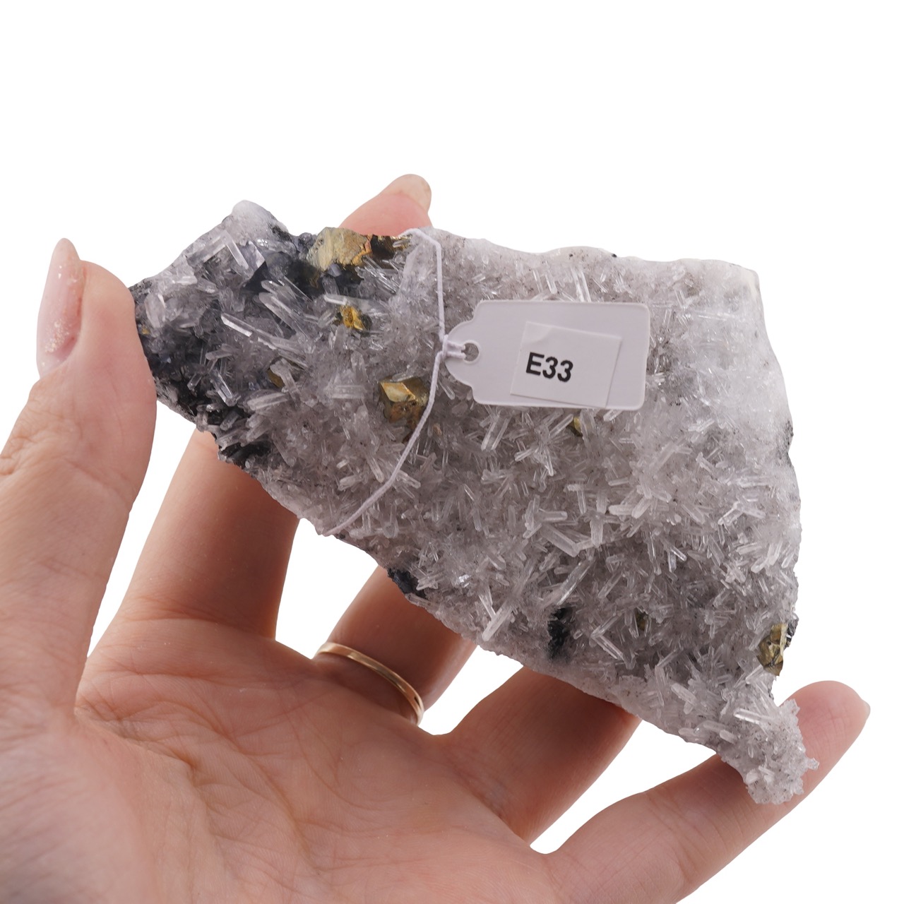 E33 este o floare de mină cu personalitate, născută în adâncul pământului din Bulgaria și destinată să-ți completeze elegant colecția. Structura sa naturală combină cristale de cuart cu luciul cald al piritei, reflexele metalice ale galenei și accentele delicate de dolomit. Ansamblul creează un joc plăcut de texturi și culori, de la transparențele fine până la suprafețele strălucitoare și mate, ușor de remarcat din orice unghi.