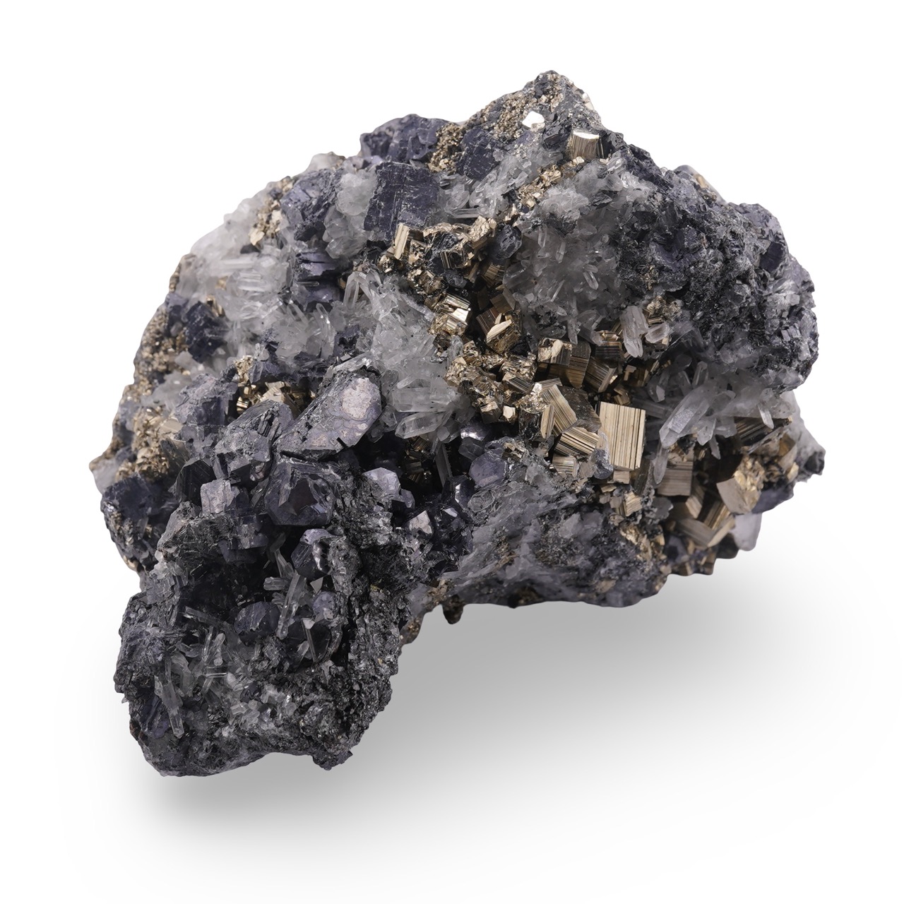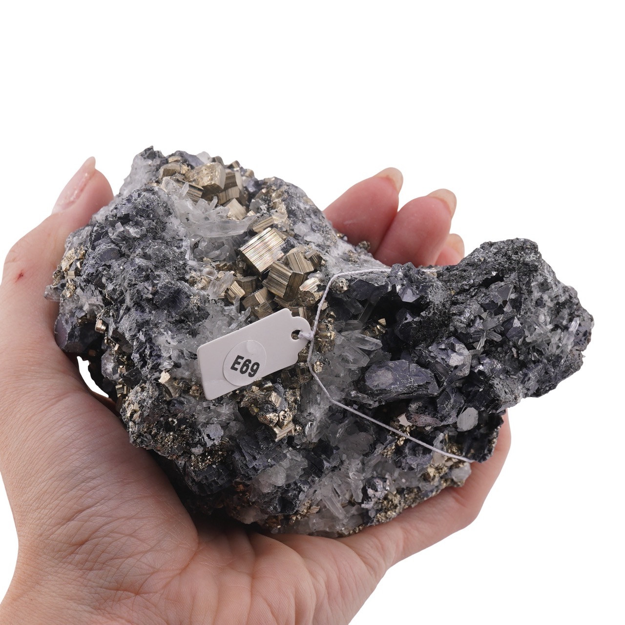 Alege E69 dacă vrei să adaugi colecției tale un cristal natural cu personalitate, în care galena, sfaleritul, pirita și cuartul își dau întâlnire într-o compoziție coerentă și plăcută privirii.