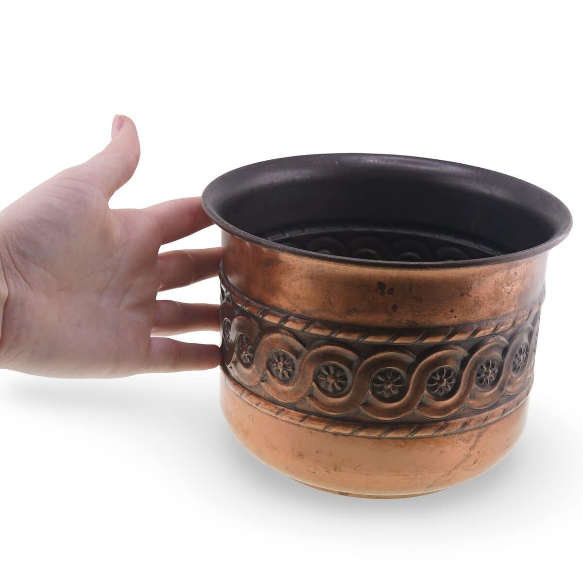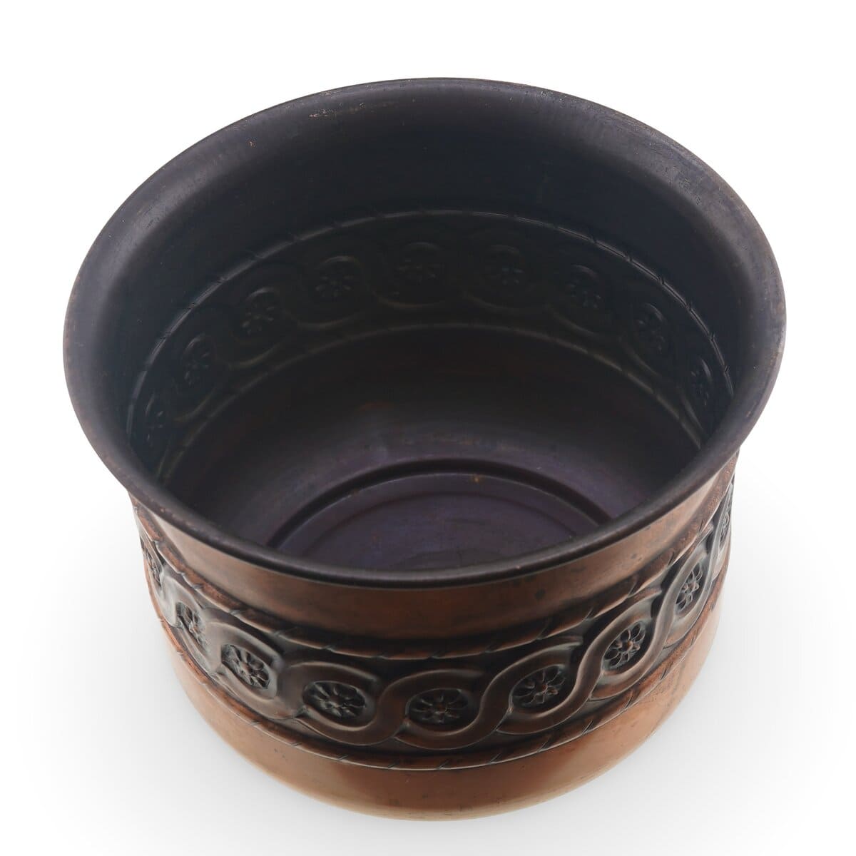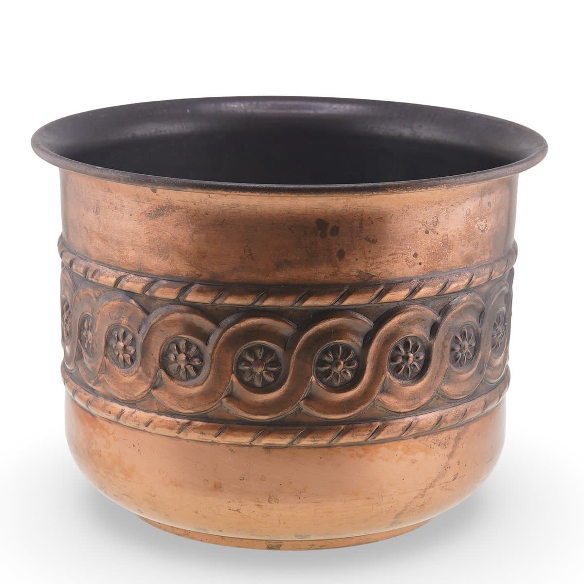 Ghiveci vintage din cupru decorat cu motive florale in relief, 16cm