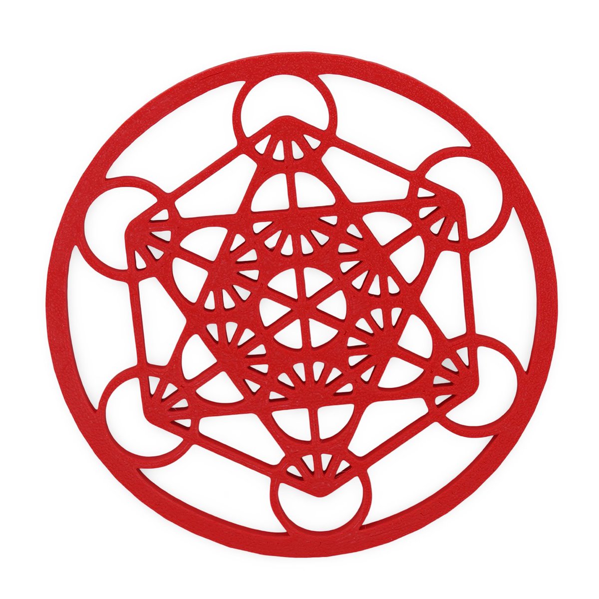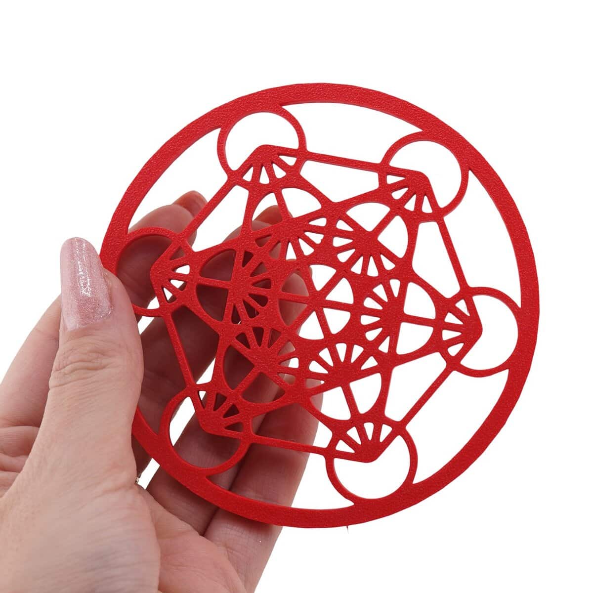 Grila pentru cristale Cubul lui Metatron, în nuanță intensă de roșu, este creată pentru tine dacă vrei să lucrezi mai conștient cu energia cristalelor și cu intențiile tale. Având o formă rotundă și un diametru de aproximativ 10 cm, această piesă este ușor de integrat pe un altar, pe birou sau într-un colț dedicat practicilor tale spirituale.