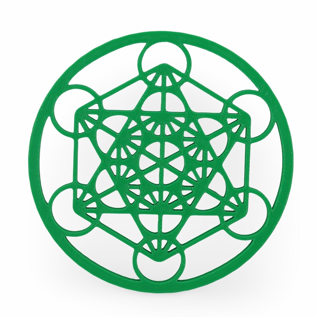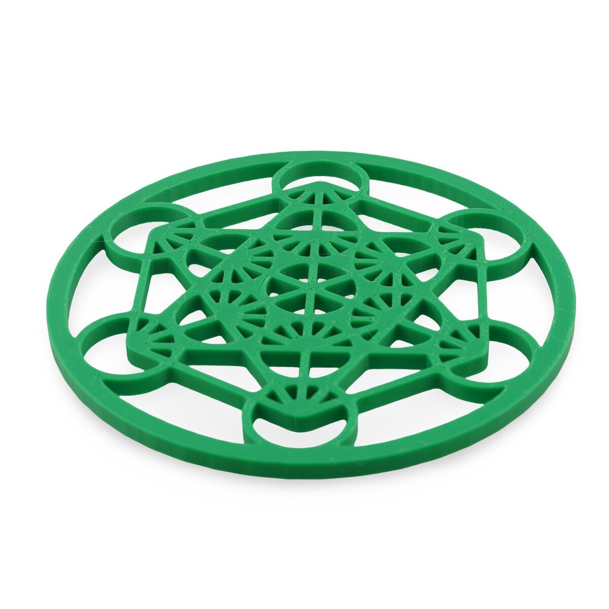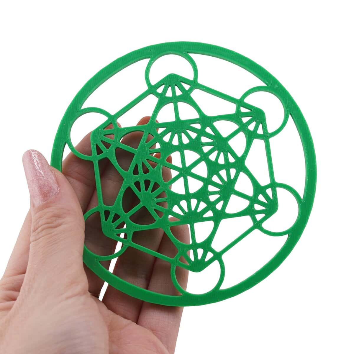 Nuanța de verde susține ideea de armonie și regenerare, ajutându-te să creezi un colț dedicat relaxării și centrării. Poți așeza pe grilă cristale pentru protecție, pentru claritate mentală sau pentru atragerea abundenței, iar simbolul Cubului lui Metatron va lucra ca un model energetic care amplifică, structurează și armonizează energia intenției pe care o setezi.