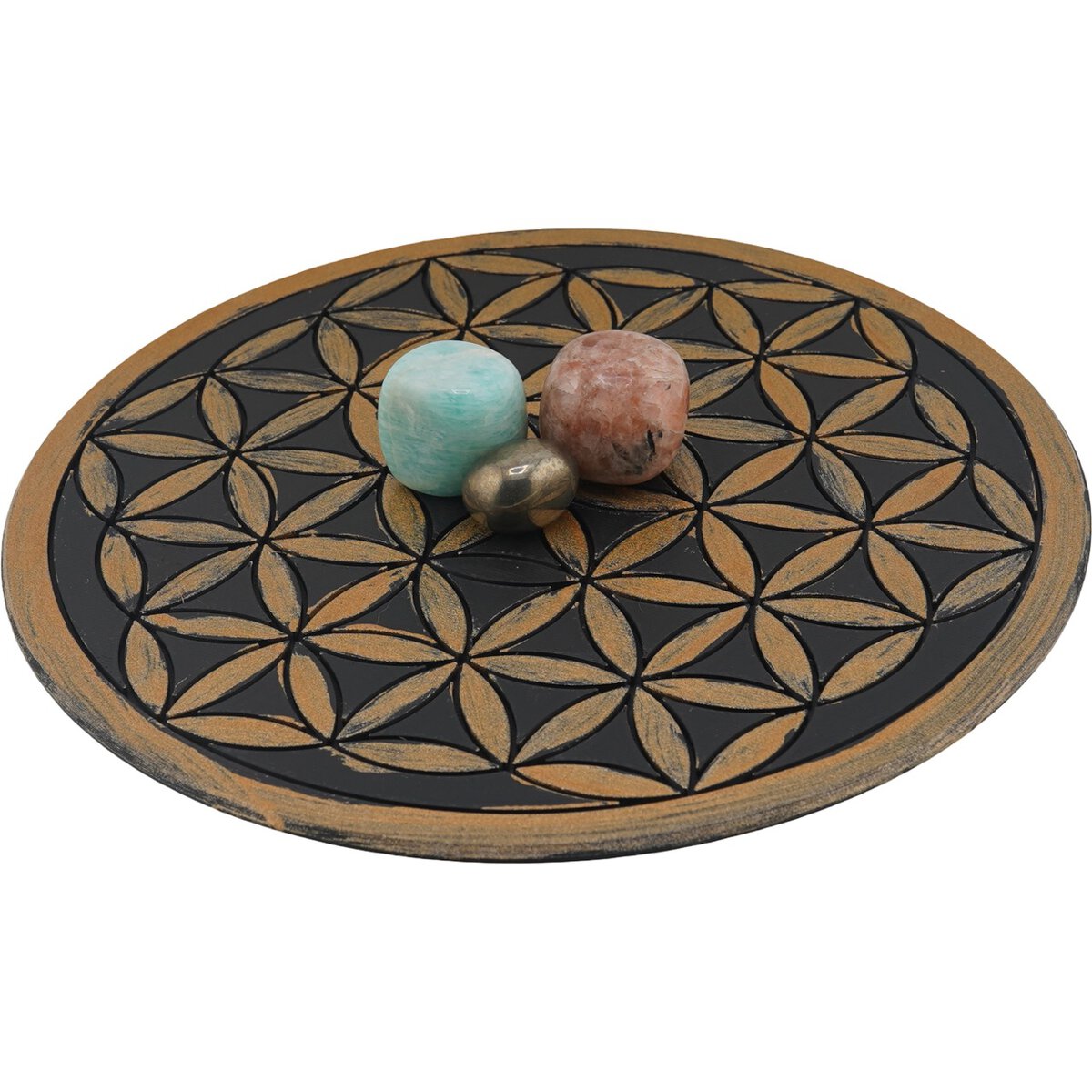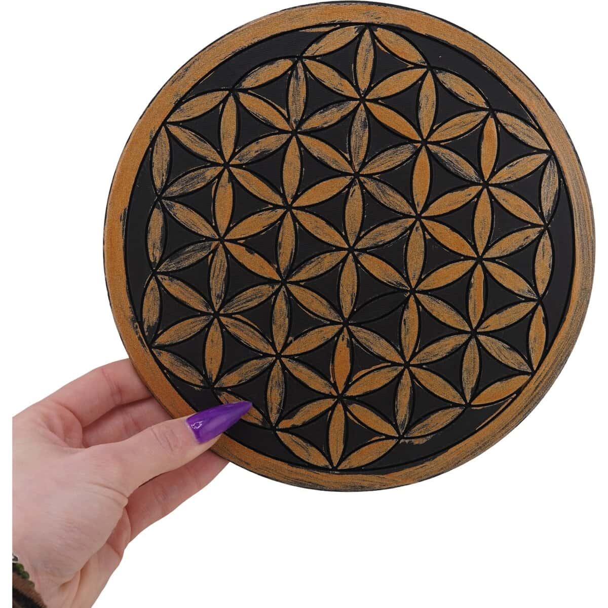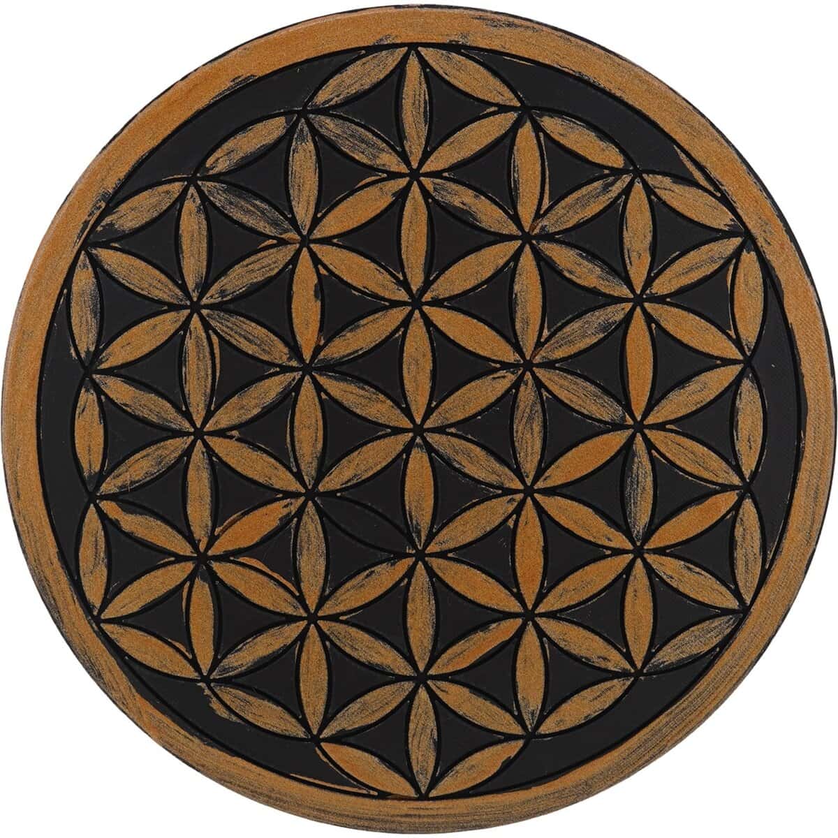 Grila pentru cristale Floarea Vieții gravată, 20 cm – negru cu accente aurii