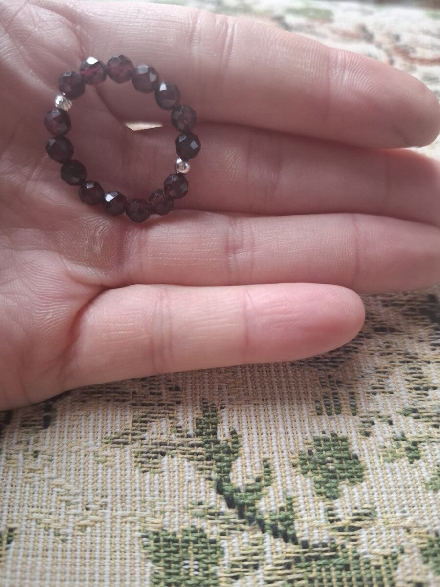 Inel pe elastic cu granat si argint 925, sfere fatetate 4mm. Confectionat din pietre semipretioase si argint 925, pe elastic.