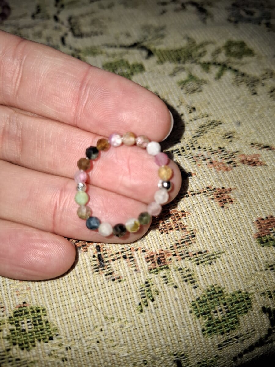 Inel pe elastic cu turmalina multicolora si argint 925, sfere microfatetate 3mm. Confectionat din pietre semipretioase si argint 925, pe elastic.