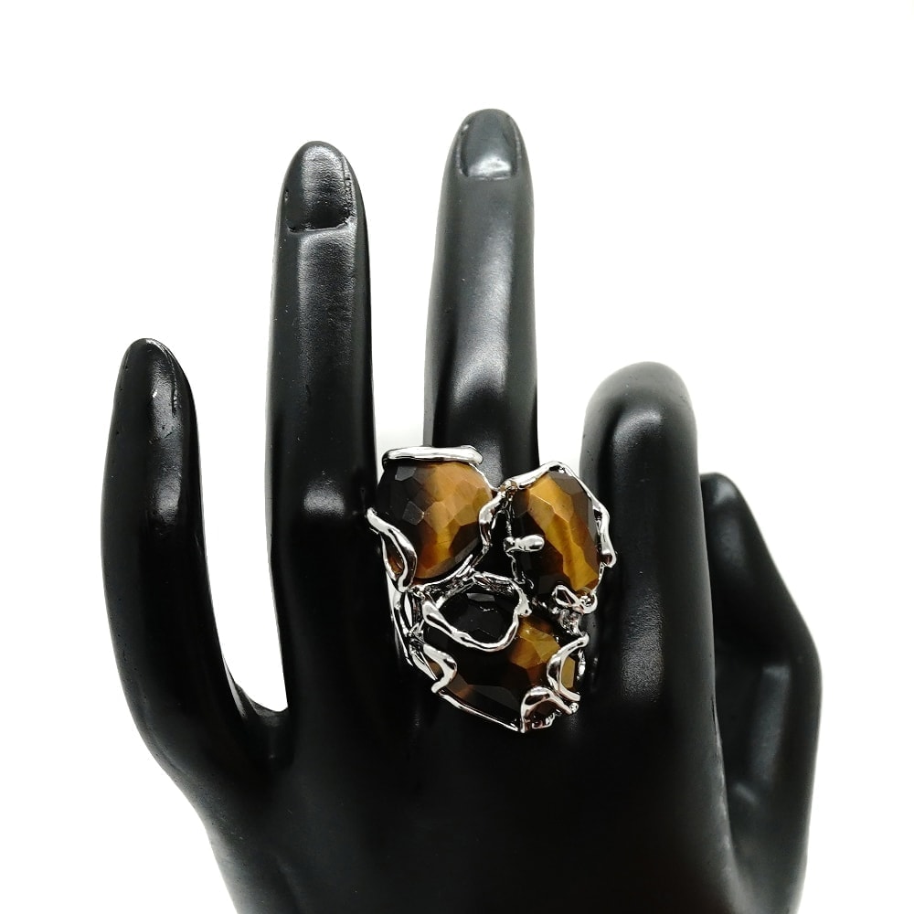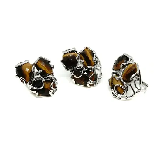 Inel reglabil cu 3 pietre fatetate de Ochi de tigru, montura argintie. Se ofera certificat de garantie si conformitate.