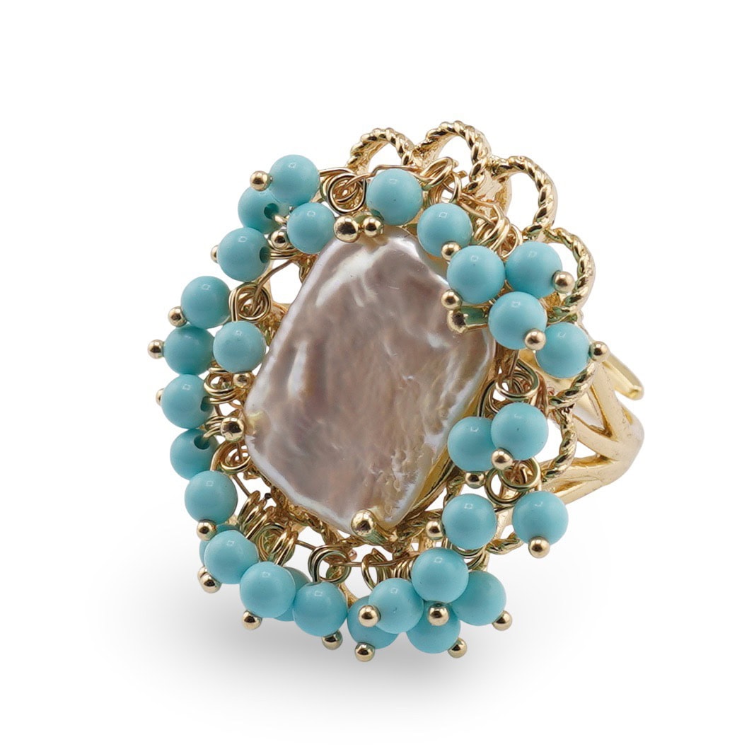 Acest inel reglabil îmbină delicatețea unei perle de cultură cu prospețimea mărgelelor turcoaz, într-un model floral cu finisaj auriu, ușor de integrat atât în ținutele de zi cu zi, cât și în cele alese pentru ocazii speciale. Designul său pune în valoare contrastul dintre alb, turcoaz și auriu, iar forma reglabilă îl face mai ușor de purtat și de oferit cadou.