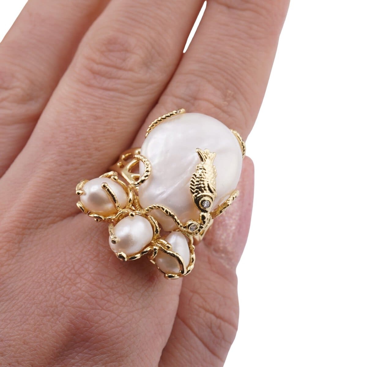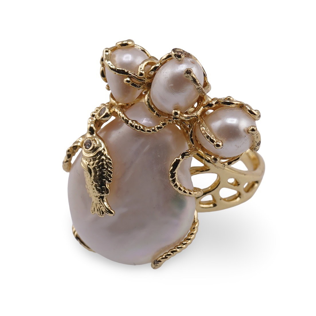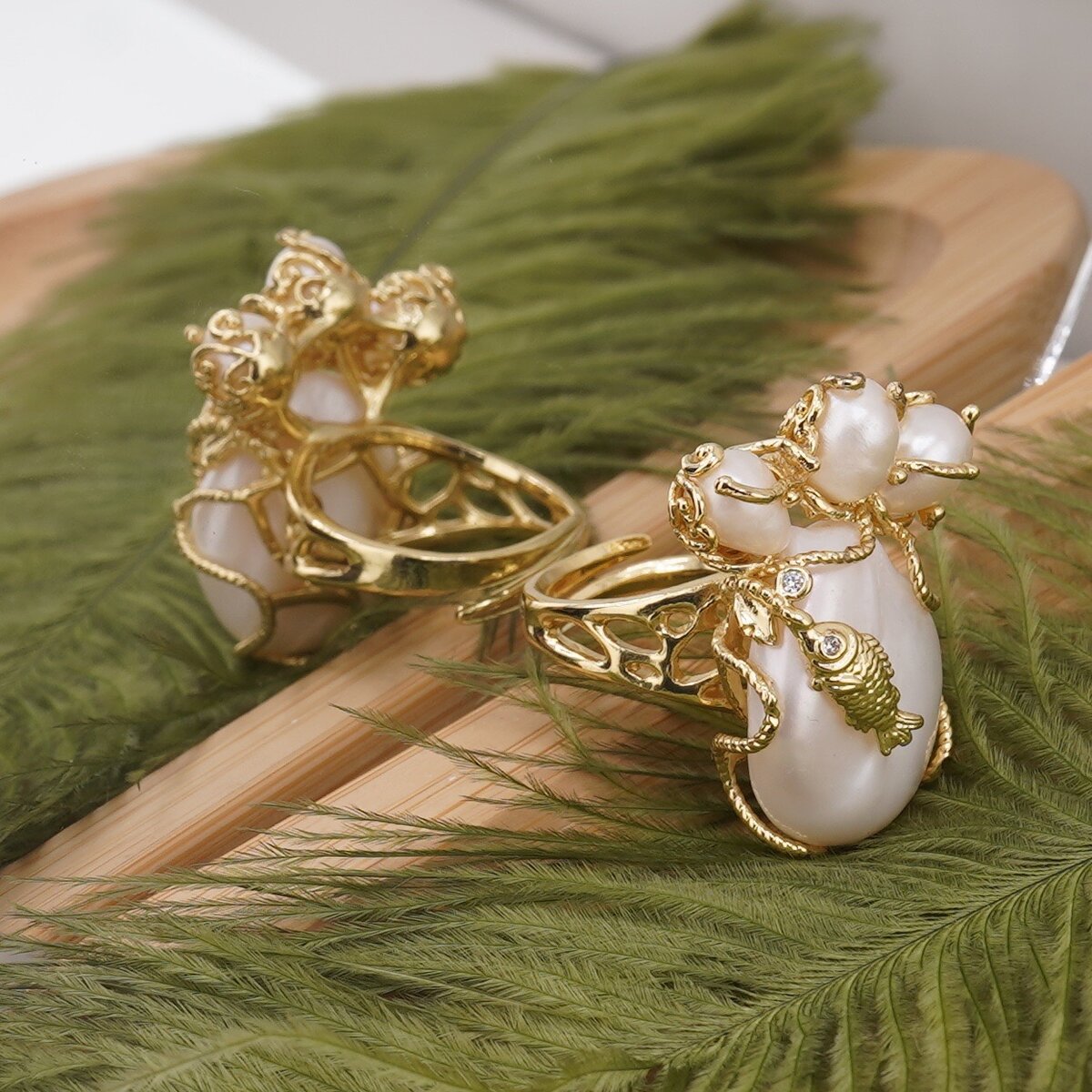 Realizat din metal auriu și perle de cultură, acest inel are un design decorativ plăcut, evidențiat de motivul pește, care adaugă personalitate fără să încarce vizual bijuteria. Dimensiunea de aproximativ 31 mm x 26 mm îl face suficient de vizibil pentru a atrage atenția într-un mod discret. Poate fi purtat singur, ca piesă principală, sau alături de alte bijuterii în tonuri calde, pentru un look armonios.