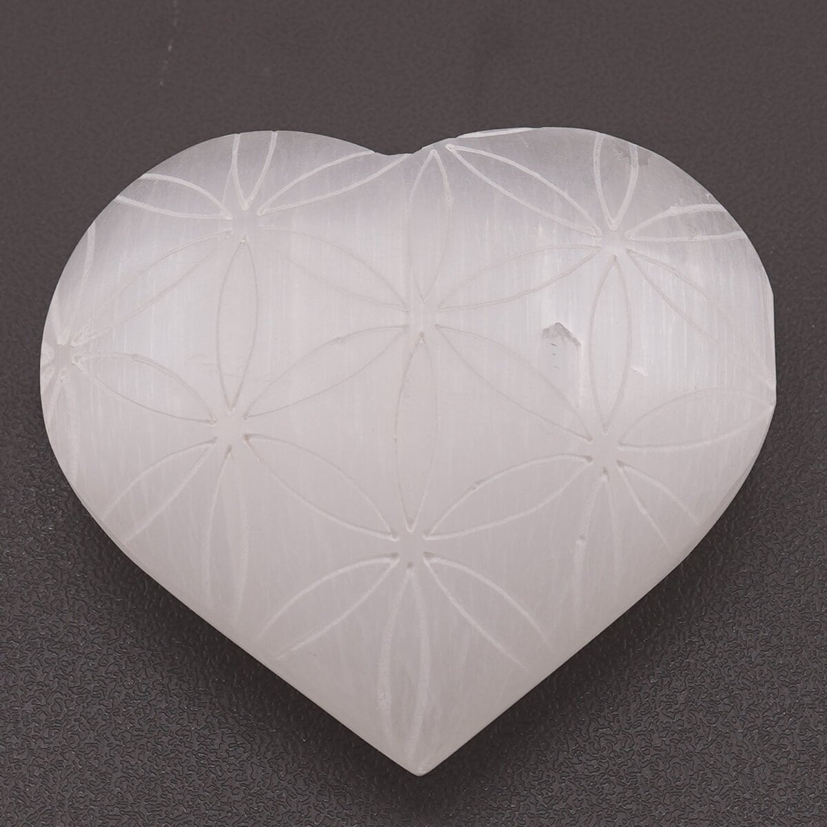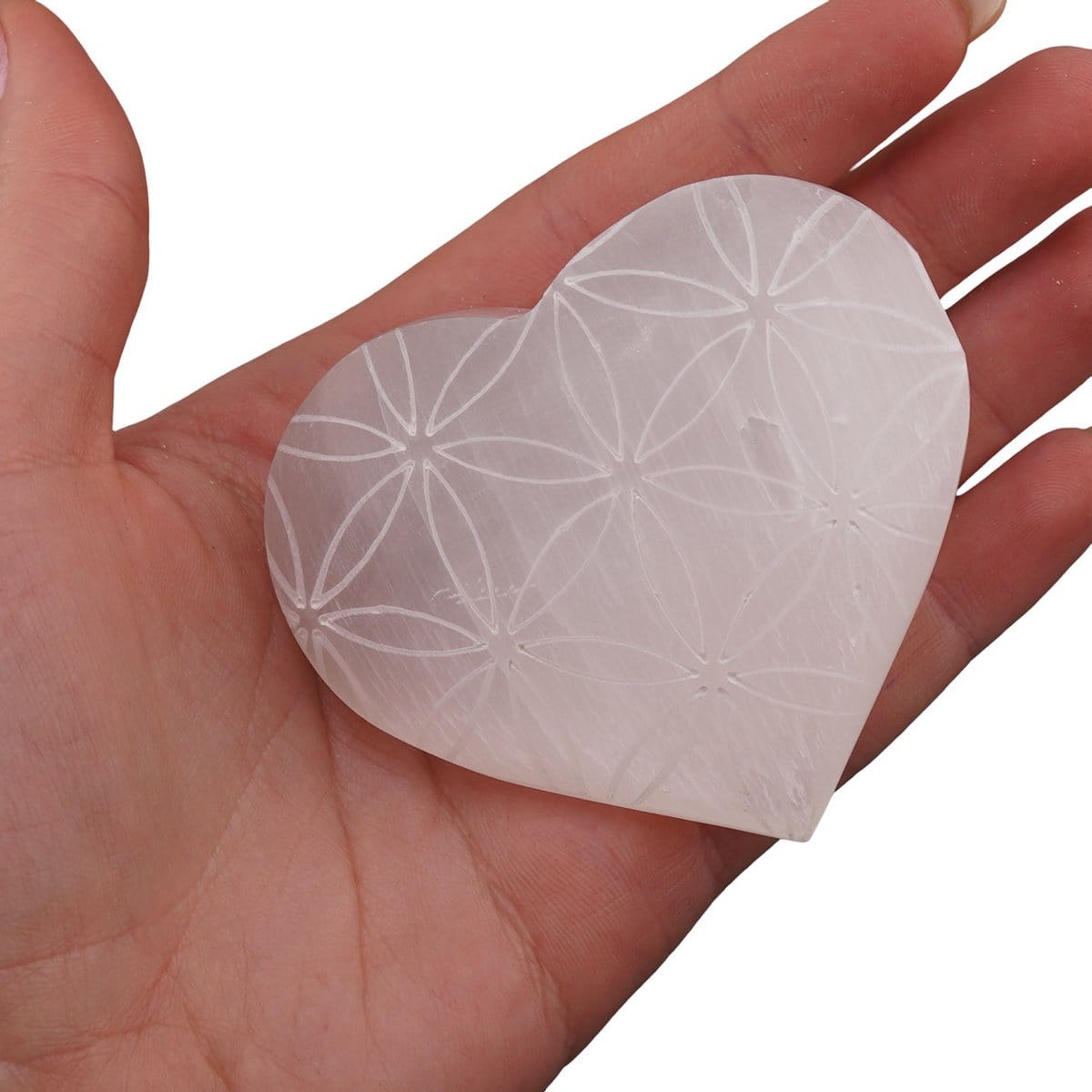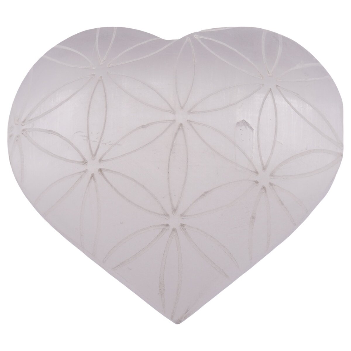 Inima din Selenit gravat cu Floarea Vieții, 6-7 cm