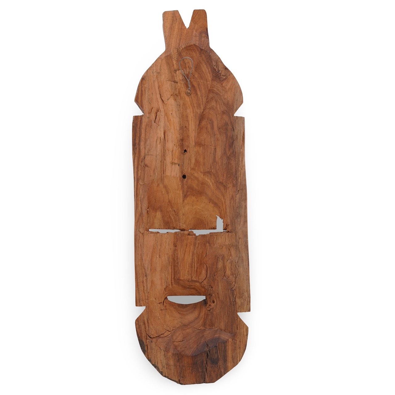 Realizată integral din lemn, masca are un aspect plăcut la atingere și o textură naturală, ușor rustică. Forma sa alungită, de aproximativ 32 cm înălțime, îngustă și ușor curbată, o face ușor de integrat chiar și pe un perete mai îngust sau într-un spațiu mic, cum ar fi un colț de hol, deasupra unei comode sau între două tablouri. Lățimea și grosimea reduse îi permit să se așeze bine pe perete, fără să încarce vizual încăperea.