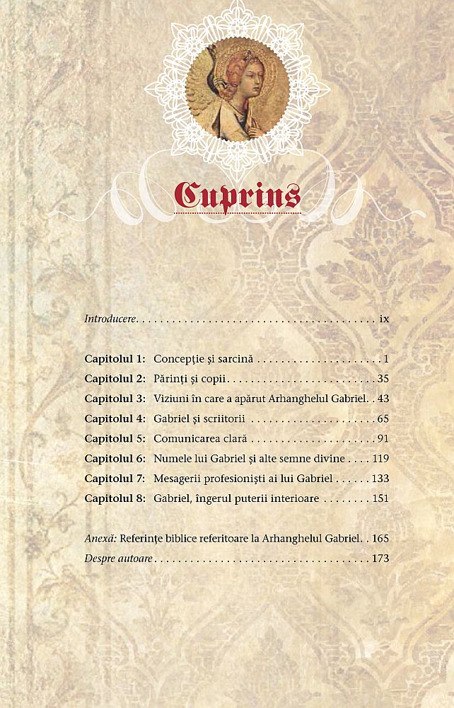 În această carte fără intenţii religioase îl vom studia pe Gabriel, îngerul-mesager. Acesta continuă să fie şi astăzi mesagerul care le ajută pe mame, dar şi pe scriitorii şi pe artiştii de pretutindeni, aşa cum vei constata citind exemplele din paginile care urmează...