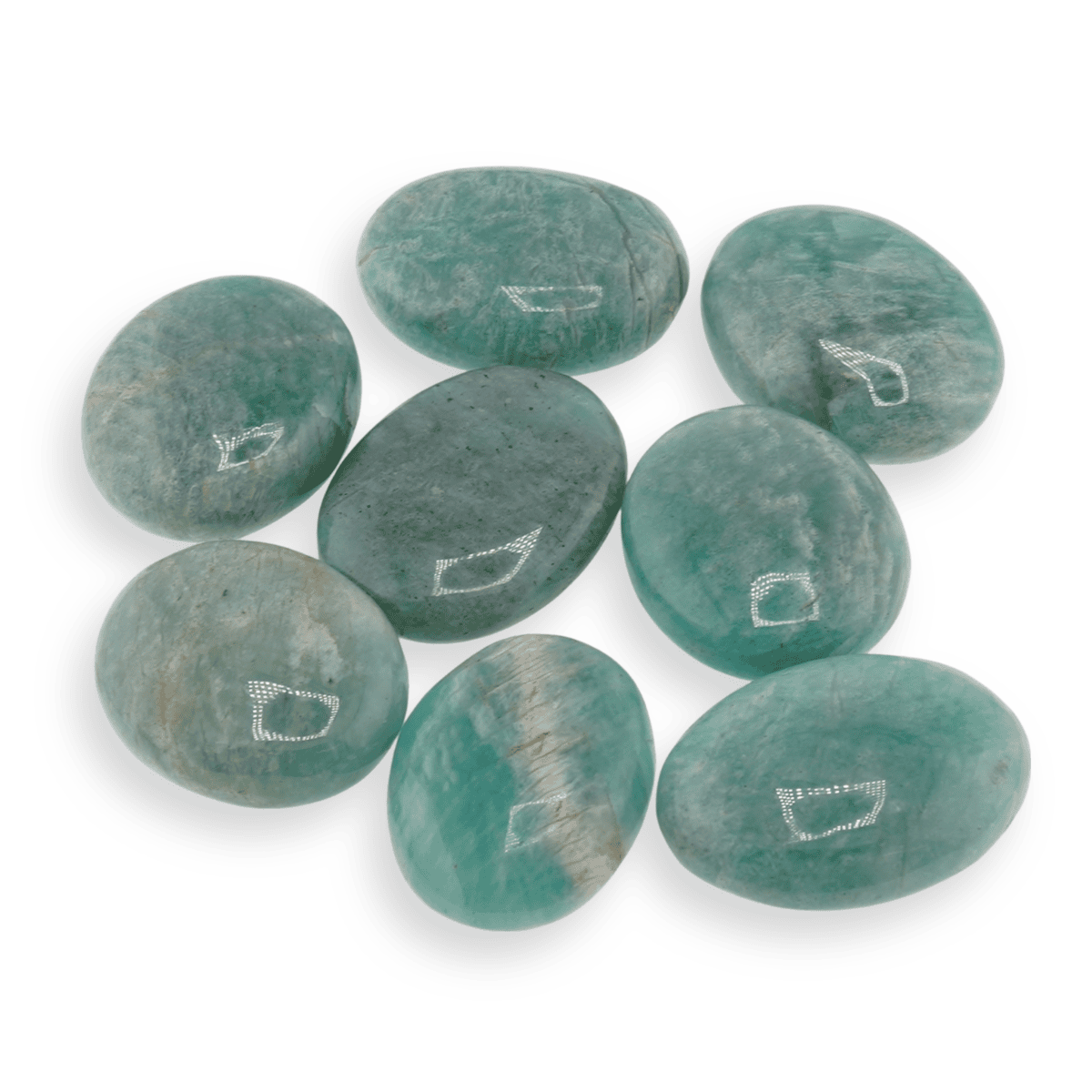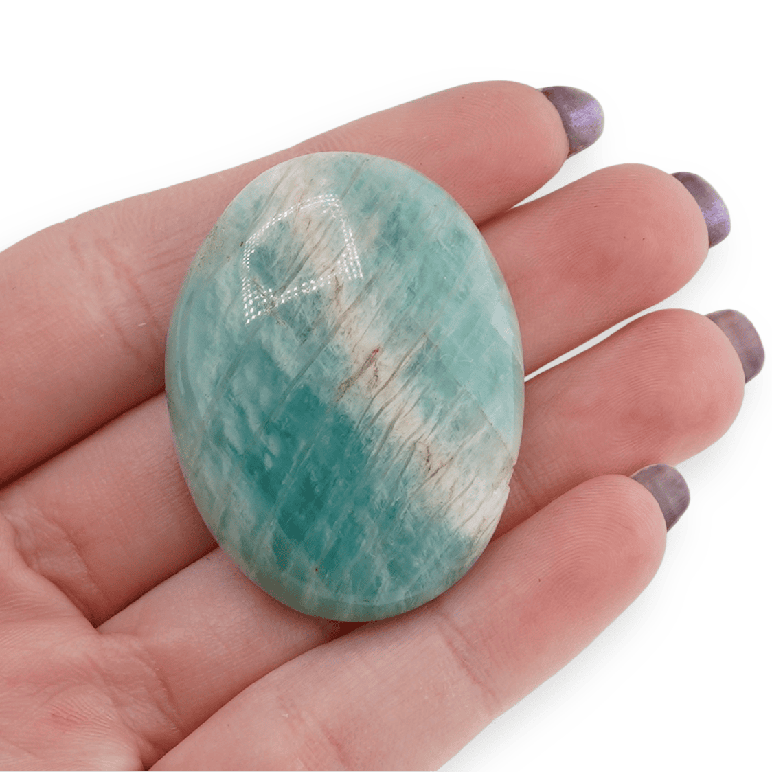 Realizat din cristal natural 100% de Amazonit (cunoscut și ca feldspat microclinic verde), are nuanțe de albastru și verde-albăstrui ce amintesc de elementul Apă. Fiecare piesă are aproximativ 3–4 cm și 25–35 g, dimensiuni potrivite pentru a fi purtată în buzunar sau ținută în palmă pe parcursul zilei. Duritatea de 6–6.5 pe scara Mohs oferă rezistență pentru utilizare frecventă, iar forma ovală îi conferă o atingere catifelată. În tradițiile energetice, Amazonitul este asociat cu Chakra Inimii (Anahata) și Chakra Gâtului (Vishuddha), susținând calmul, creșterea stimei de sine, protecția energetică și armonia în relațiile de cuplu. Simbolic, este conectat cu Jupiter și Venus, fiind o alegere inspirată pentru Fecioară, Pești și Vărsător, dar și pentru cei născuți în luna decembrie sau în zilele de luni și vineri.