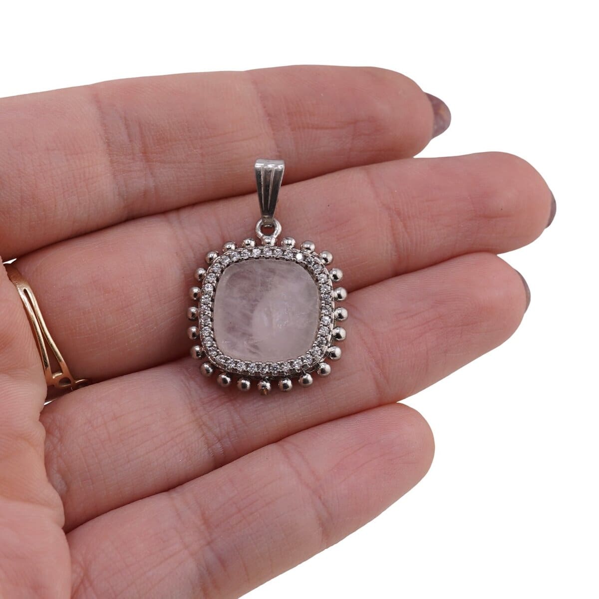 Pentru momentele în care vrei să adaugi o notă calmă ținutelor tale, acest pandantiv din cuart roz te întâmpină cu o culoare blândă și un luciu plăcut. Piatra naturală este șlefuită într-o formă pătrată, cu muchii netede, iar montura cu finisaj argintiu pune discret în evidență nuanțele delicate de roz. Dimensiunea de 20 mm este echilibrată, suficient de vizibilă pentru a atrage privirea, dar confortabilă pentru purtare zilnică.