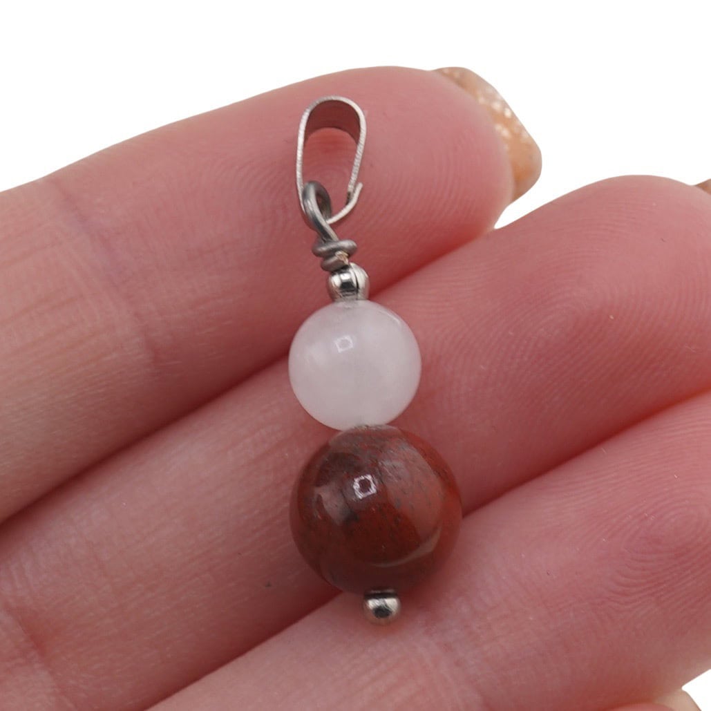 Cuartul roz este cunoscut pentru energia sa blândă, asociată cu iubirea, compasiunea și deschiderea emoțională. Nuanța sa roz pal aduce o notă caldă și calmă, ușor de integrat în ținutele de zi cu zi. Alături de el, jaspul roșu, cu tonurile sale intense de roșu, adaugă stabilitate, curaj și determinare. Împreună, aceste cristale naturale creează un pandantiv care te poate însoți în momentele în care ai nevoie atât de liniște, cât și de susținere interioară.
