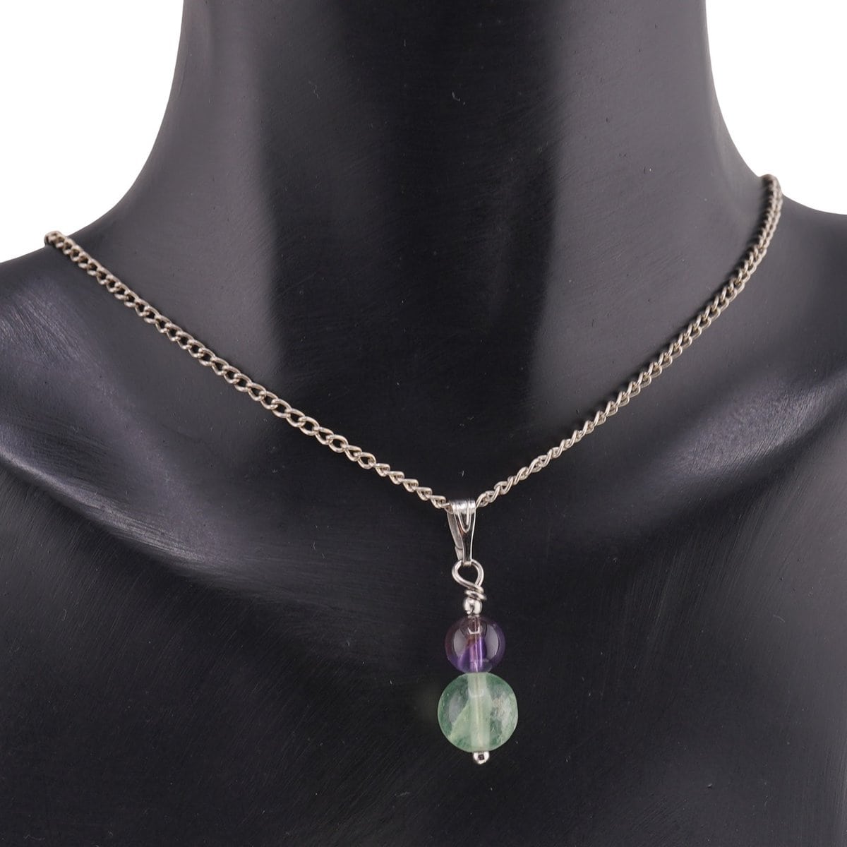 Cristalele de fluorit din acest pandantiv sunt naturale 100% și sunt șlefuite sub formă de sfere, pentru o senzație plăcută la atingere și o energie blândă. Prin nuanțele sale de mov și verde, fluoritul este adesea asociat cu vindecarea emoțională și cu eliberarea de tensiuni interioare, susținând o stare de calm mental. Este un cristal apreciat mai ales în lucrul cu chakra frunții (Ajna) și chakra coroanei (Sahasrara), zone legate de intuiție, viziune interioară și conexiune spirituală.