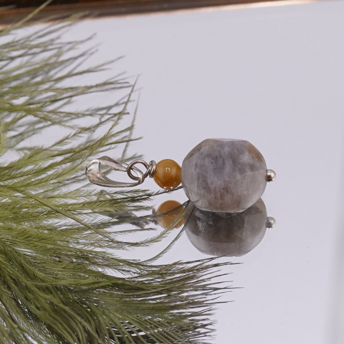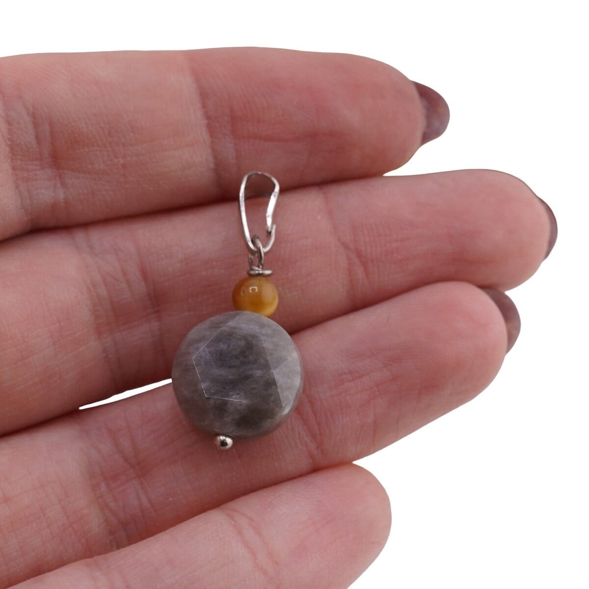 Un pandantiv discret și echilibrat, creat din cristale naturale 100%, în care griul misterios al labradoritului în formă de bănuț se întâlnește cu accentul auriu al unei sfere fine de ochi de tigru. Labradoritul, cunoscut și ca labradorite sau feldspat plagioclazic, este adesea numit piatra magiei, iar ochiul de tigru, un cuarț cu incluziuni de oxid de fier, este recunoscut ca Tiger’s Eye și piatra curajului. Împreună, cele două pietre semiprețioase aduc un mix plăcut de calm, claritate și energie, potrivit pentru purtare zilnică.