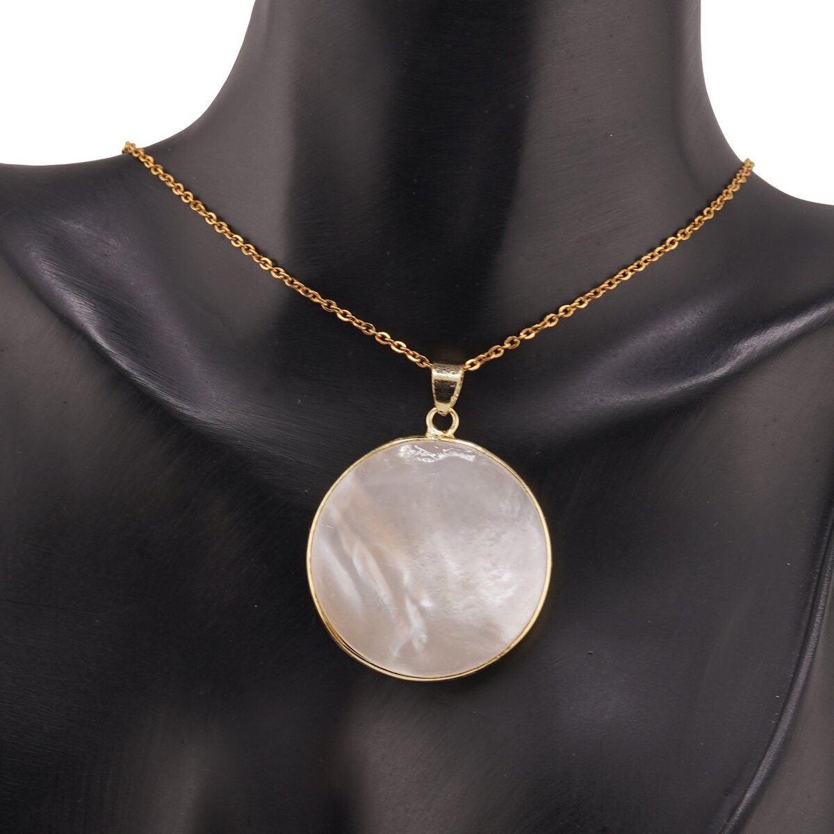 Pandantivul rotund din sidef alb cu montură aurie, cu diametrul de aproximativ 31,5 mm, este o alegere inspirată pentru tine dacă îți dorești un accesoriu delicat, cu o energie calmă și liniștitoare. Strălucirea sa naturală, perlată, provine din stratul de carbonat de calciu format în interiorul scoicilor, cunoscut și sub numele de Mother of Pearl sau piatra liniștii.