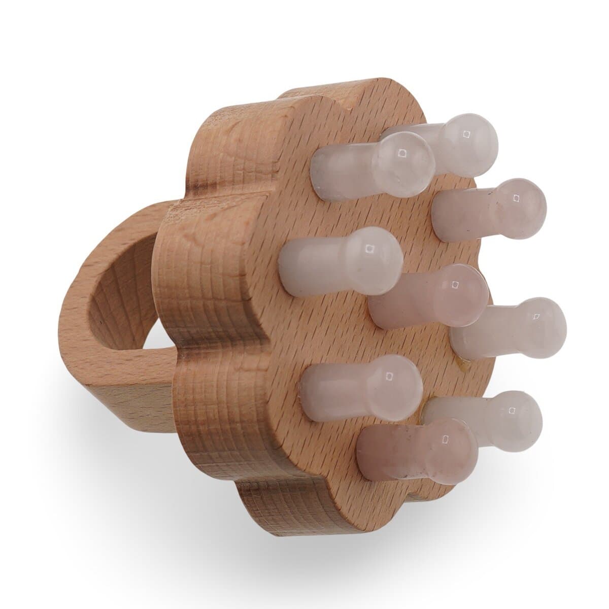 Acest pieptene rotund pentru masaj îmbină lemnul cu cristale naturale din cuart roz, într-un format compact de 6 cm, ușor de folosit acasă sau de luat cu tine în geantă. Este un aparat de masaj simplu și practic, potrivit pentru momentele în care vrei să îți oferi câteva minute de relaxare, fie în rutina de îngrijire, fie după o zi încărcată.
