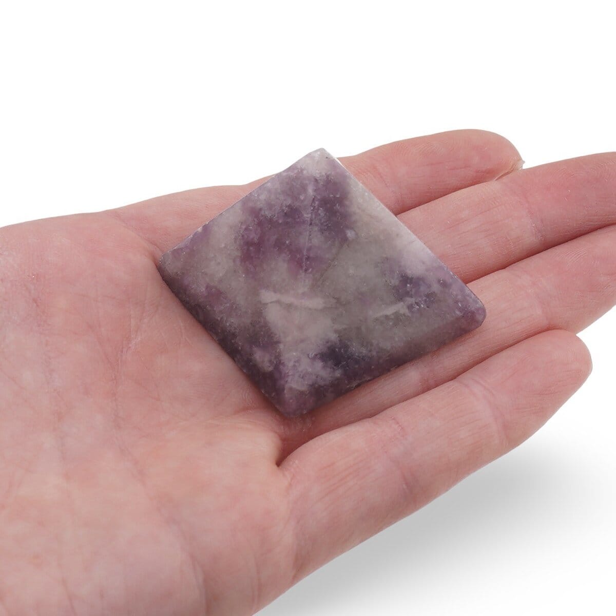 Având o bază de aproximativ 30-40 mm, această piramidă are o prezență discretă, dar vizibilă, fiind ușor de integrat în decor sau într-o colecție de pietre semiprețioase. Lepidolitul are o duritate de 2.5–3 pe scara Mohs, ceea ce înseamnă că este bine să fie manipulat cu grijă și păstrat separat de cristalele mai dure, pentru a evita zgârierea.