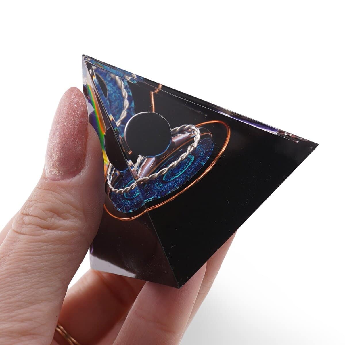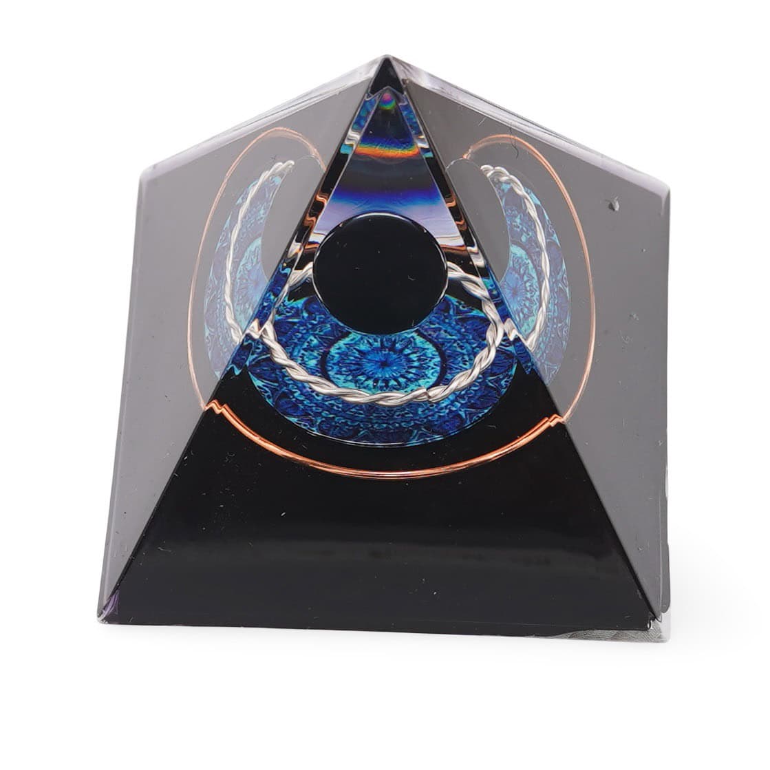 - Tip produs: piramidă orgon din rășină, metal și Obsidian natural