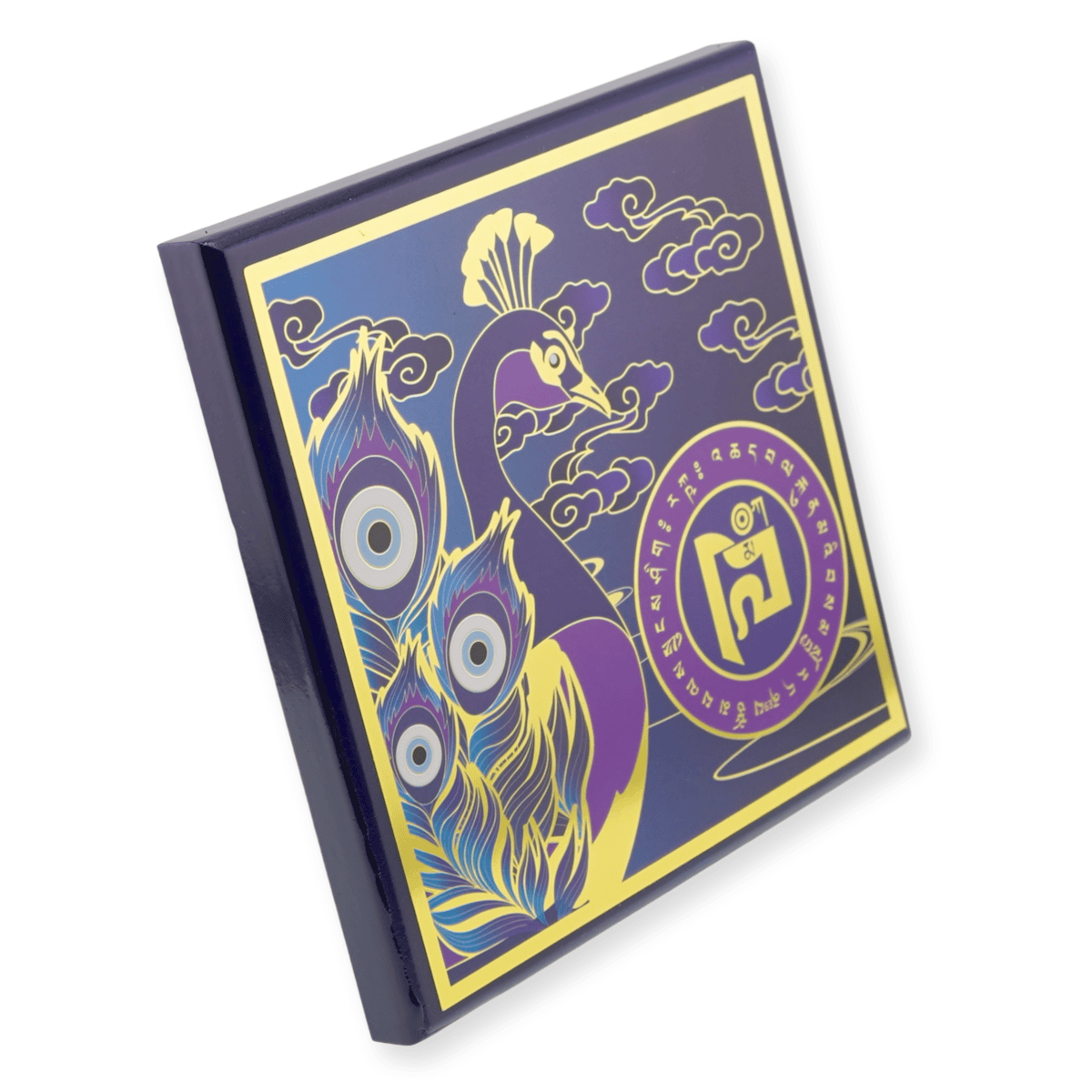 Placa este realizată din lemn de cea mai bună calitate, având dimensiunile de 130mm x 130mm x 10mm. Simbolul Paunului este cunoscut pentru puterea sa de a aduce noroc și o stare favorabilă în casă, fiind asociat și cu protecția împotriva accidentelor.
