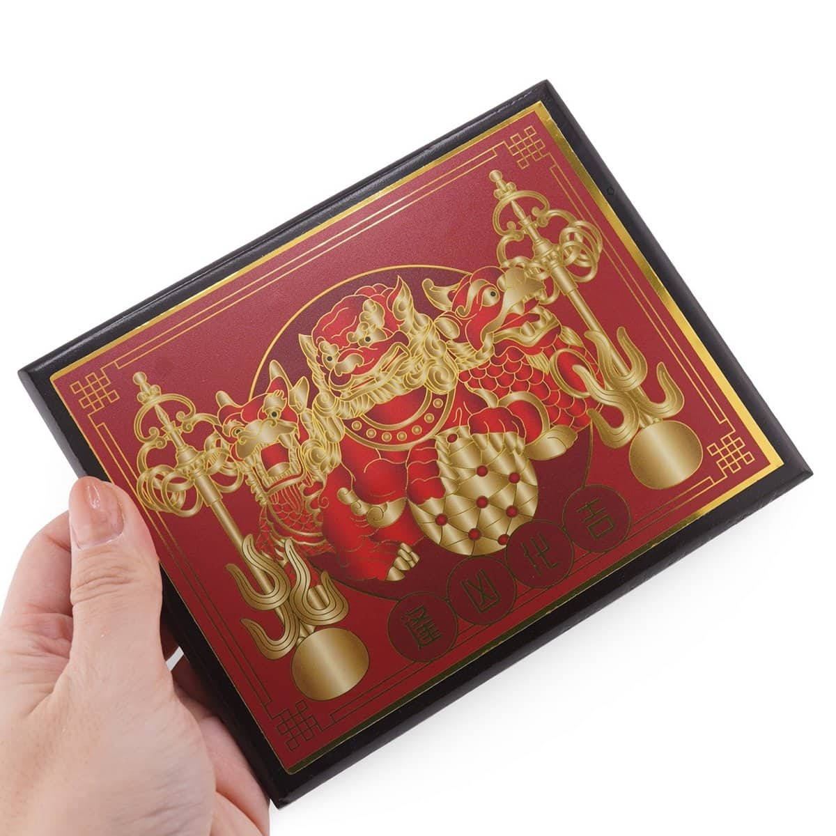 - Această placă puternică îi prezintă pe Chi Lin, Pi Yao și Fu Dog, cei trei gardieni cerești venerați pentru capacitatea lor de a supune cele Trei Ucideri, o afecțiune anuală majoră care aduce risc de pierdere, trădare și eșecuri. Placa include instrumente