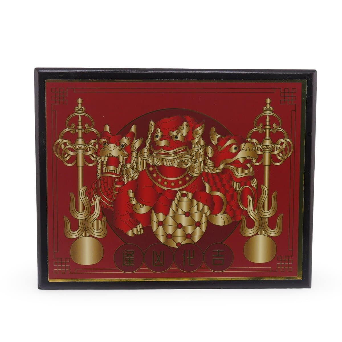 Această placă Feng Shui din lemn reunește într-o compoziție expresivă pe Chi Lin, Pi Yao și Fu Dog, cunoscuți ca cei trei gardieni cerești. În tradiție, ei sunt venerați pentru capacitatea de a calma influența celor Trei Ucideri, o afecțiune anuală majoră asociată cu risc de pierdere, trădare și eșecuri. Alături de ei, uneltele lui Ksiddigarbha sunt reprezentate pentru a susține intenția de protecție și stabilitate pe tot parcursul anului 2026.