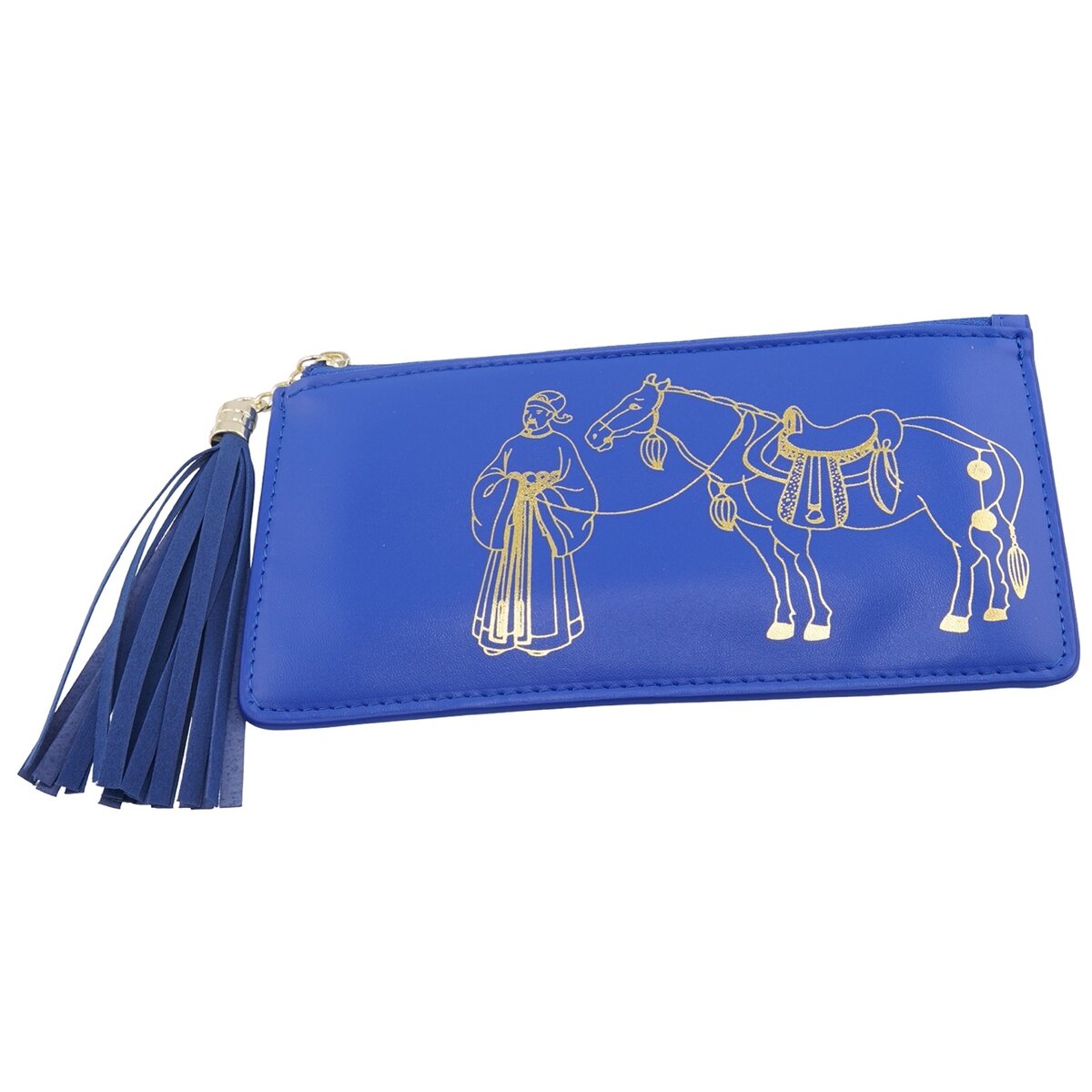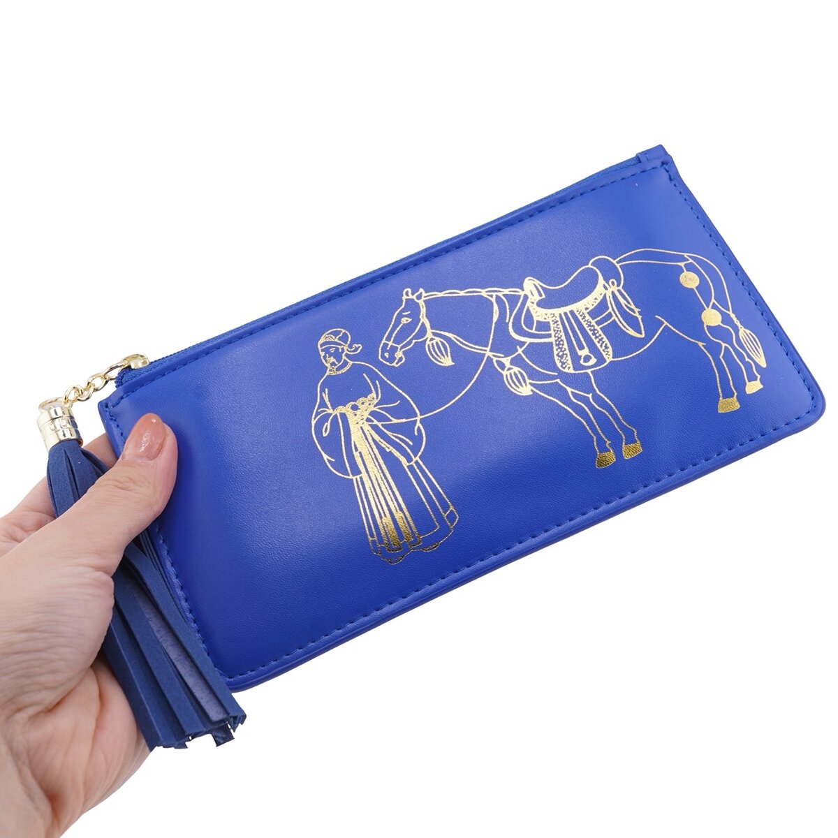 Gândit pentru a te însoți zi de zi, acest portofel dreptunghiular din piele ecologică îmbină utilul cu un simbol de bun augur: Zeul Bogăției conducând Calul Tribut. Nuanța albastră, calmă și echilibrată, este pusă în valoare de detalii aurii, creând o prezență discretă, potrivită pentru întâlniri, drumuri zilnice sau momentele în care vrei să păstrezi aproape intenția de prosperitate.