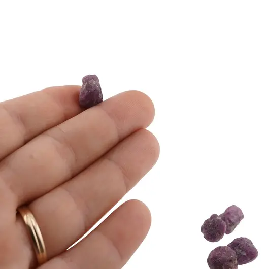 Piatra are dimensiuni de aproximativ 8–10 mm și o greutate de 1–1,5 g, ușor de purtat în buzunar ori de așezat pe birou sau pe un altar personal. Duritatea de 9 (din 10) pe scara Mohs îi oferă rezistență la uzul curent, iar aspectul de bulgăre pune în valoare caracterul autentic al rubinului. Cunoscut și ca Ruby sau „piatra pasiunii”, rubinul este adesea ales pentru intenții legate de energie și vitalitate, curaj și încredere în sine, precum și pentru focalizarea pe abundență financiară.