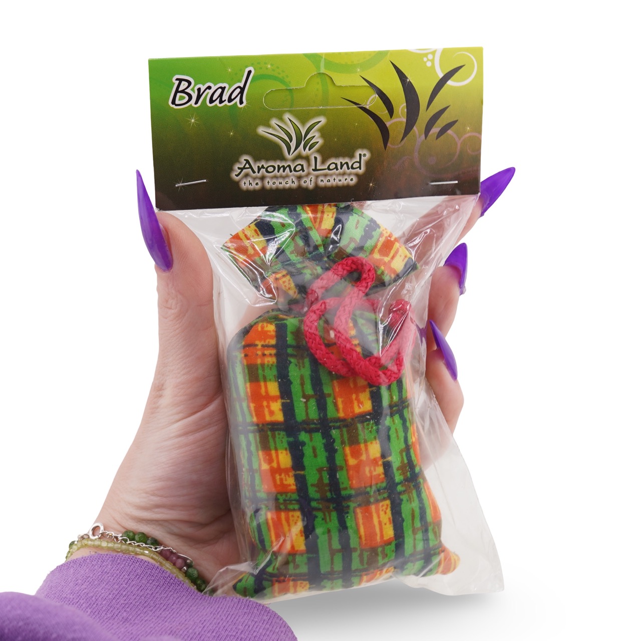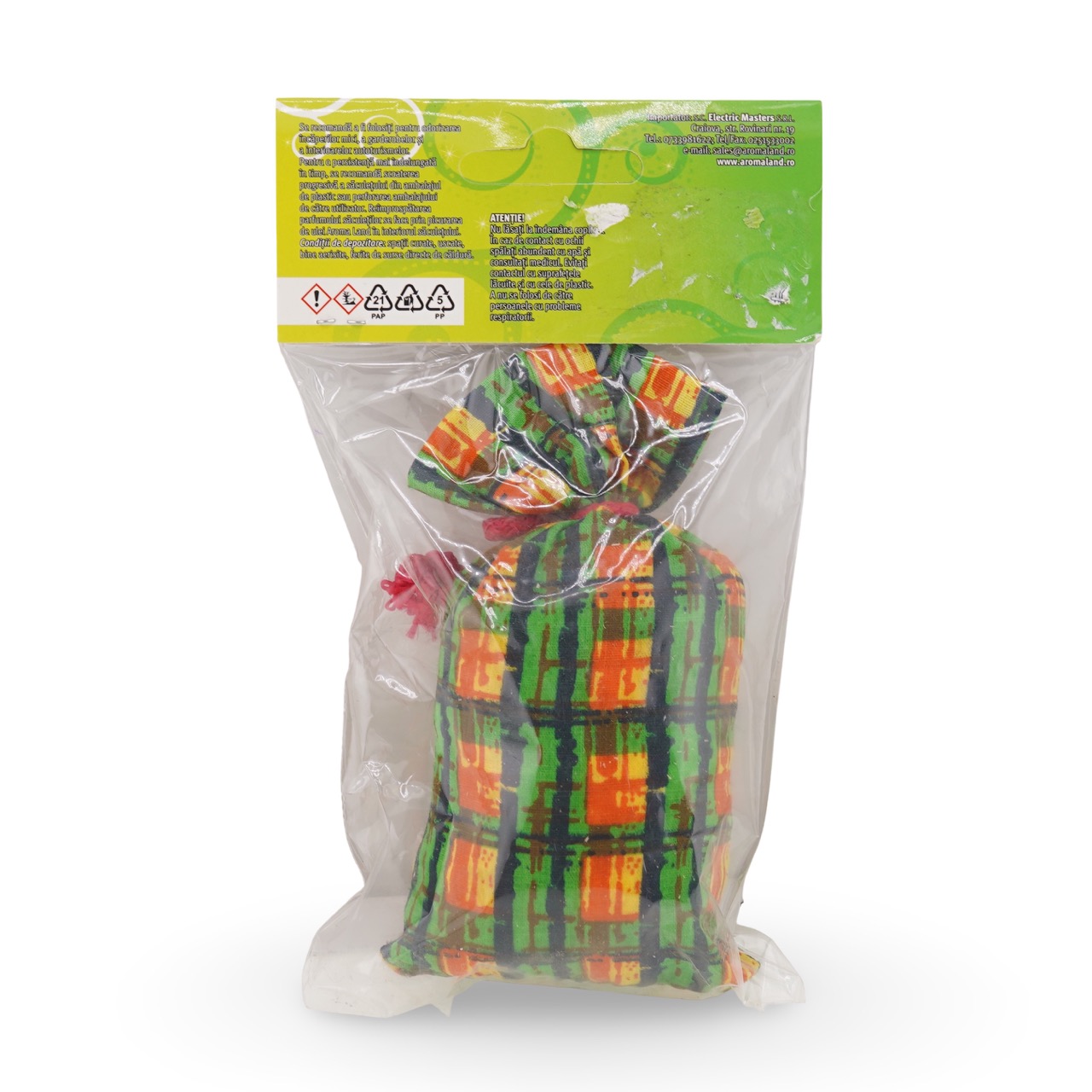 Parfumul este obținut dintr-un material lemnos impregnat cu aromă de brad, care eliberează treptat mirosul, fără să fie agresiv. Acest material este adăpostit într-un săculeț textil, cu aspect multicolor, ce adaugă o notă veselă și caldă spațiului în care îl folosești. Forma clasică de săculeț îl face ușor de integrat oriunde ai nevoie de un plus de prospețime: în autoturism, în dulapul cu haine, în sertare sau chiar în hol, lângă pantofar.