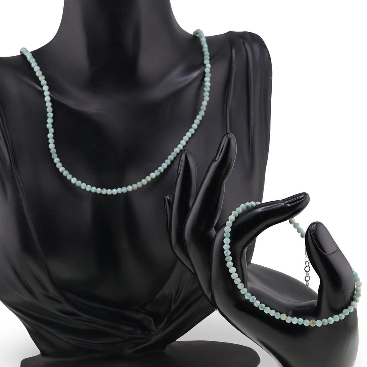 Creat pentru momentele in care ai nevoie de echilibru si claritate, acest set de bijuterii din Amazonit natural 100% imbina stralucirea discreta a sferelor fatetate de 3 mm cu tonul albastru linistitor specific pietrei din Rusia. Colierul are o lungime de 43 cm, gandit sa se aseze comod la baza gatului, iar bratara completeaza armonios tinuta, fie ca alegi un stil relaxat sau unul elegant. Textura fina si taietura fatetata capteaza suav lumina, oferind un accent rafinat pentru fiecare zi.