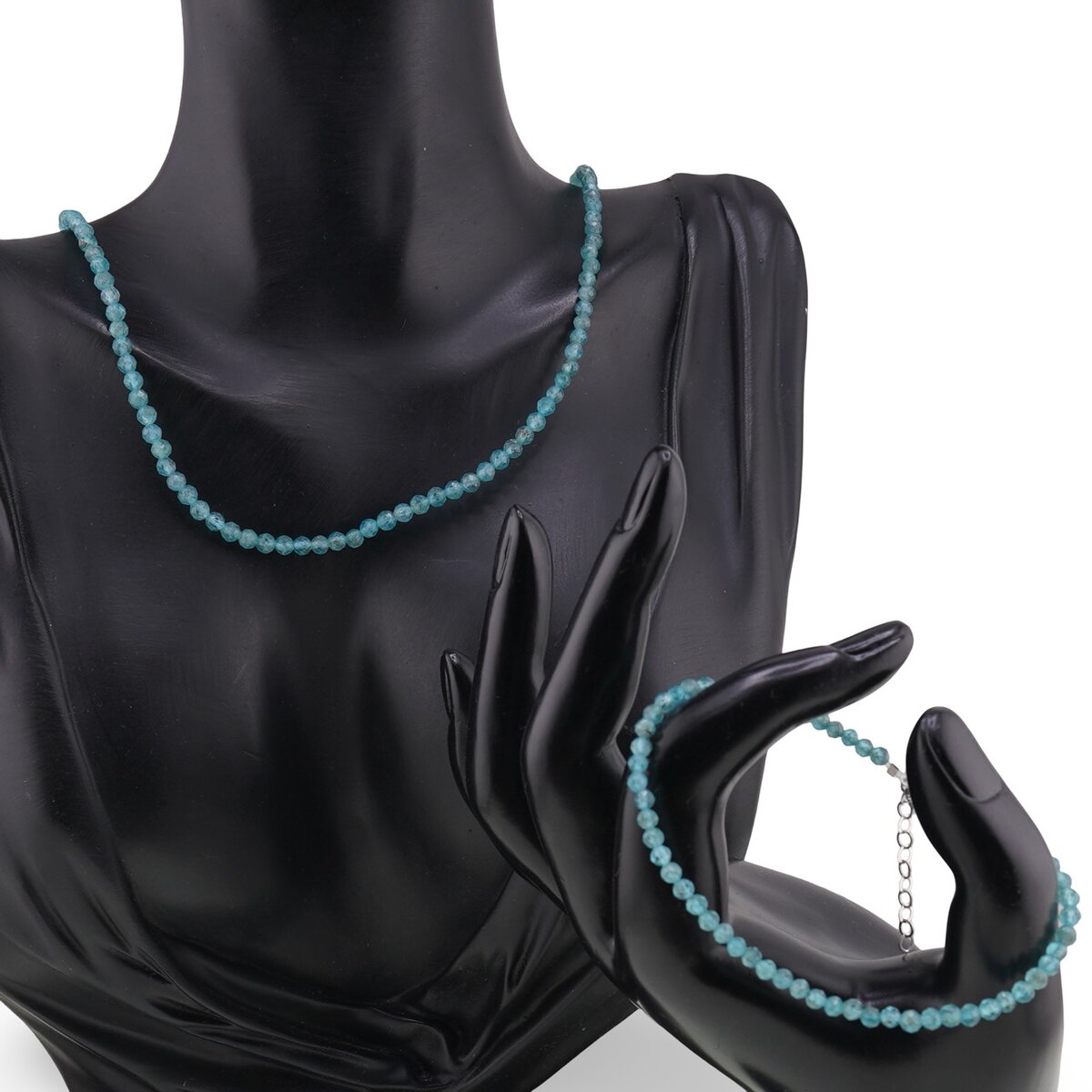 Alege pentru tine un set de bijuterii cu cristale naturale 100%, într-o nuanță plăcută de albastru. Brățara și colierul din Apatit sunt realizate din sfere fațetate de 3 mm, cu o strălucire discretă, potrivite pentru purtare zilnică sau momente speciale. Colierul are o lungime de 43 cm, iar componentele metalice pot fi din metal comun sau din argint 925, astfel încât să te simți confortabil în orice stil alegi.