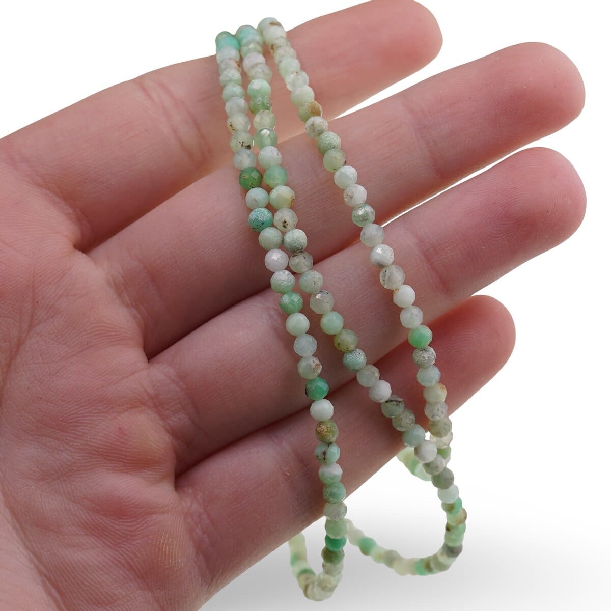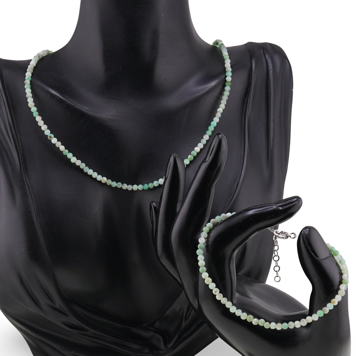 Acest set de bijuterii din pietre semipretioase te întâmpină cu o nuanță de verde proaspăt, plin de viață. Brățara și colierul sunt realizate din Crisopraz 100% natural, cunoscut și ca Chrysoprase, cuart microcristalin verde sau piatra regenerării. Mărgelele fine, sub formă de sfere fațetate de 3 mm, surprind lumina discret și oferă un luciu plăcut, ușor de purtat zi de zi. Colierul are o lungime de 43 cm, așezându-se elegant la baza gâtului, iar accesoriile metalice sunt din metal comun sau argint 925, în funcție de variantă.