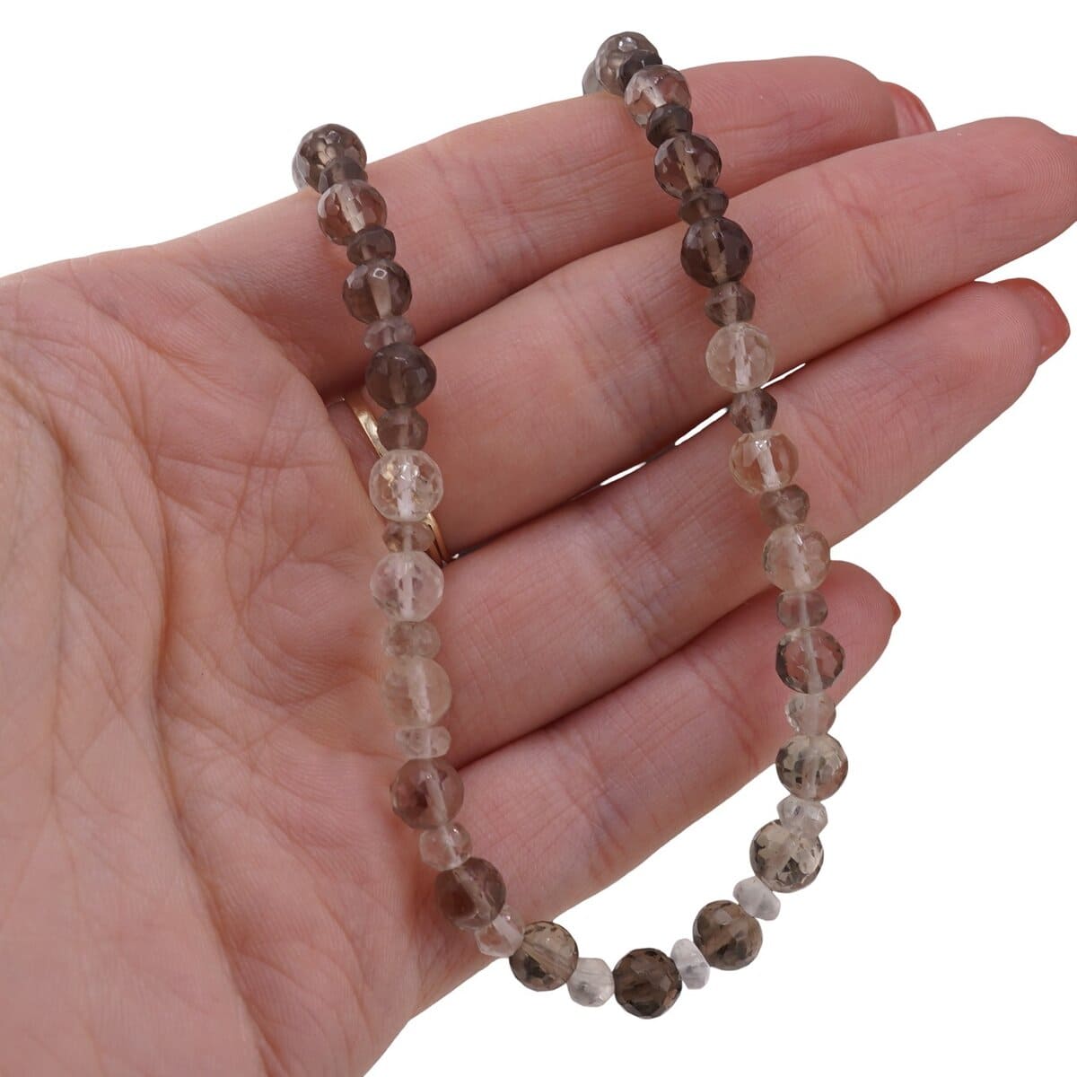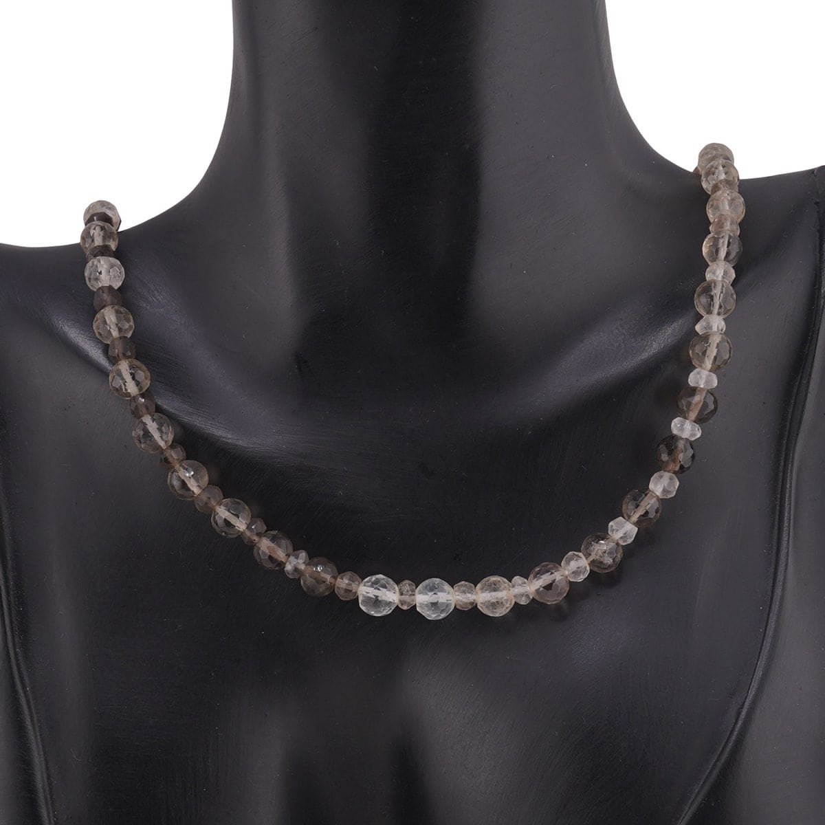 Colierul are o lungime de aproximativ 43 cm, ceea ce îl face confortabil de purtat aproape de linia gâtului, fără să fie prea strâns. Cristalele naturale de cuart fumuriu sunt șlefuite sub formă de sfere și discuri fațetate, astfel încât fiecare mișcare a ta prinde un joc delicat de lumini. Textura lor fină și luciul discret dau un aer rafinat, ușor de observat, dar nu ostentativ.