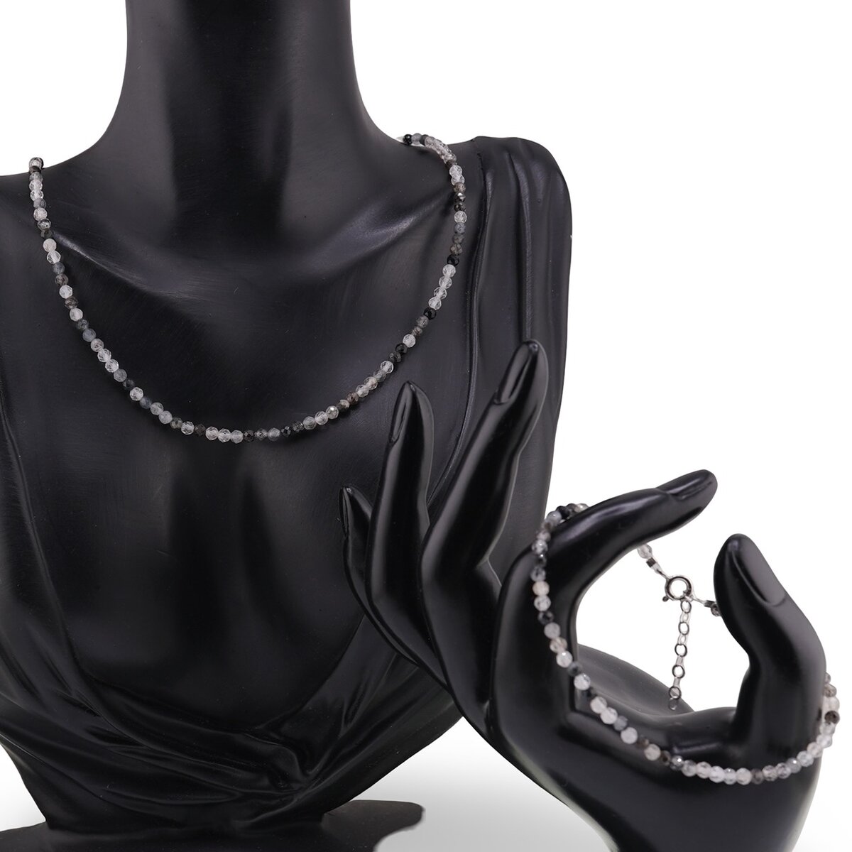 Descoperă un set de bijuterii discret și expresiv, creat din cuart turmalinat, un cristal natural 100% în care transparența cuarțului se împletește cu filamente negre de turmalină. Contrastul dintre negru și transparent conferă profunzime fiecărei piese, iar sferele fațetate de 3 mm captează lumina cu un luciu fin, ușor de asortat la ținute casual sau elegante.