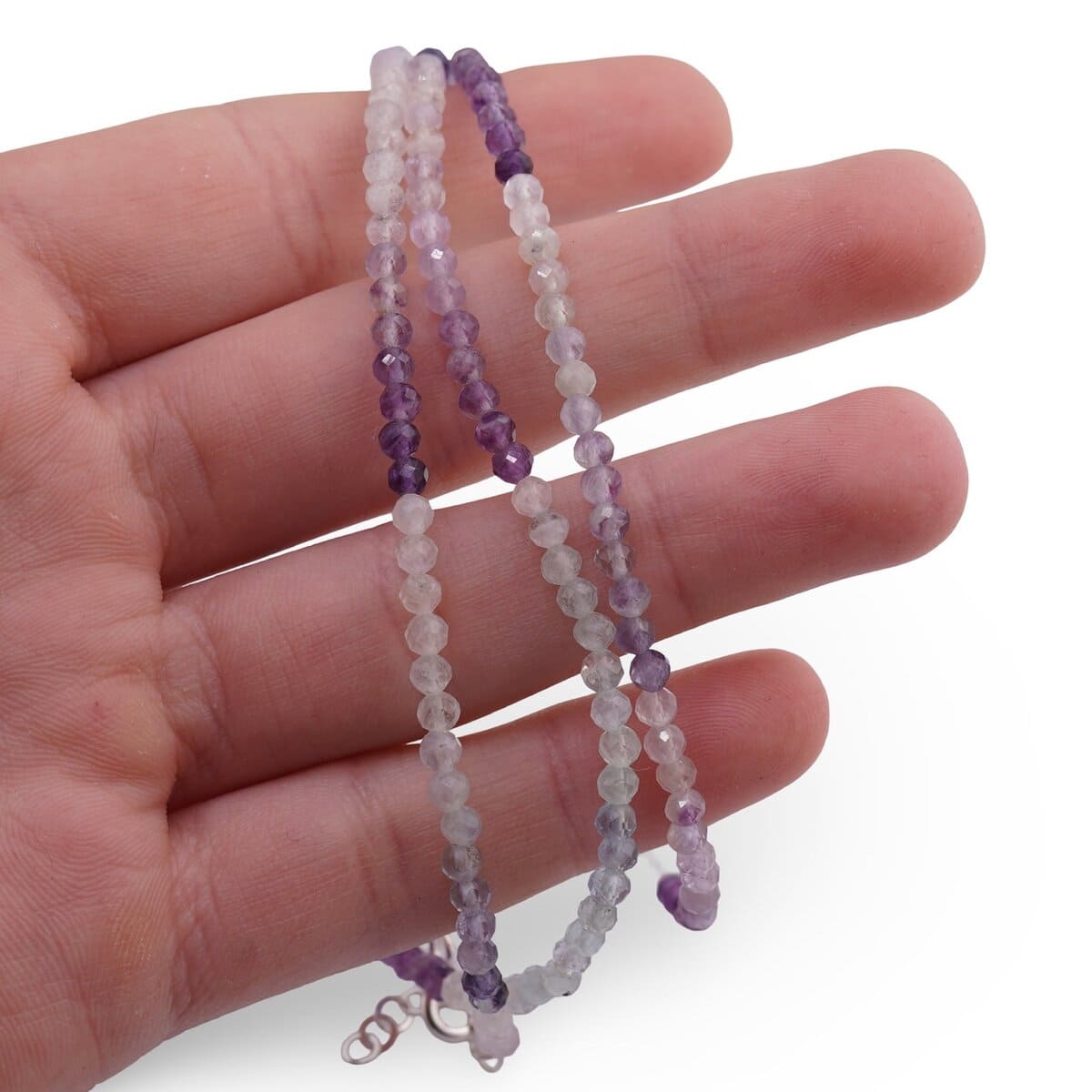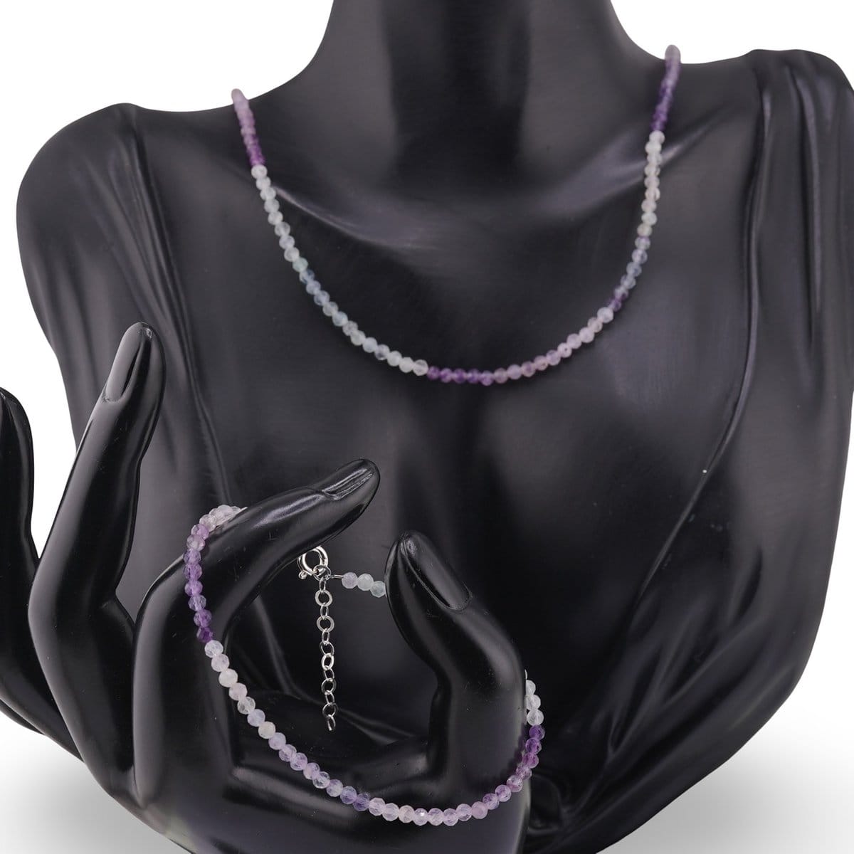 Alege pentru tine un accent discret și plin de sens: setul de brățară și colier din Fluorit în nuanțe de mov degrade, realizat din cristale naturale 100%. Mărgelele sferice fațetate de 3 mm surprind lumina cu eleganță, iar colierul are o cădere comodă, de aproximativ 43 cm, potrivită pentru ținutele de zi sau pentru momentele în care vrei să meditezi și să-ți clarifici intențiile.