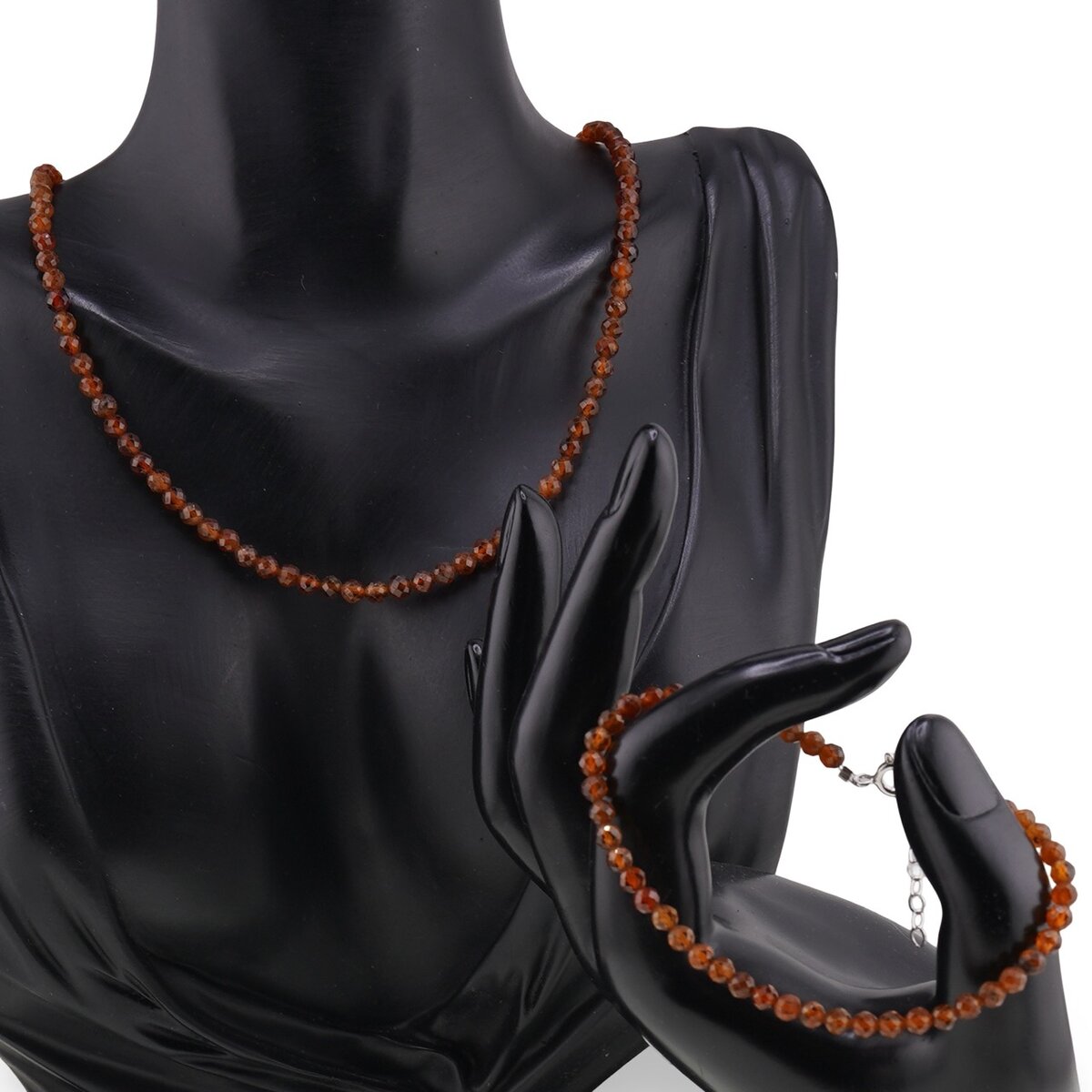 Acest set de bijuterii aduce aproape strălucirea caldă a granatului hessonit, într-un degrade portocaliu discret, plăcut ochiului. Colierul are 43 cm și se așază elegant aproape de claviculă, iar brățara completează firesc ținutele de zi cu zi. Ambele piese sunt realizate din cristale naturale 100%, în sfere fațetate de 4 mm ce prind frumos lumina, și sunt completate de elemente metalice din metal comun sau argint 925, pentru un finisaj echilibrat.