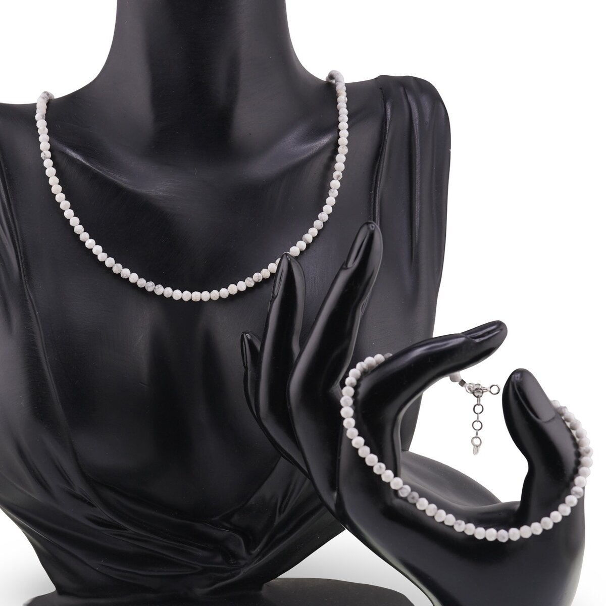 Un duo discret și plăcut de purtat zi de zi, setul reunește o brățară fină și un colier elegant din howlit natural, alcătuite din sfere fațetate de 3 mm. Nuanțele calme de alb și gri, cu desenul lor ușor mătăsos, creează un efect luminos și echilibrat, iar colierul de aproximativ 43 cm așază pietrele confortabil la baza gâtului.