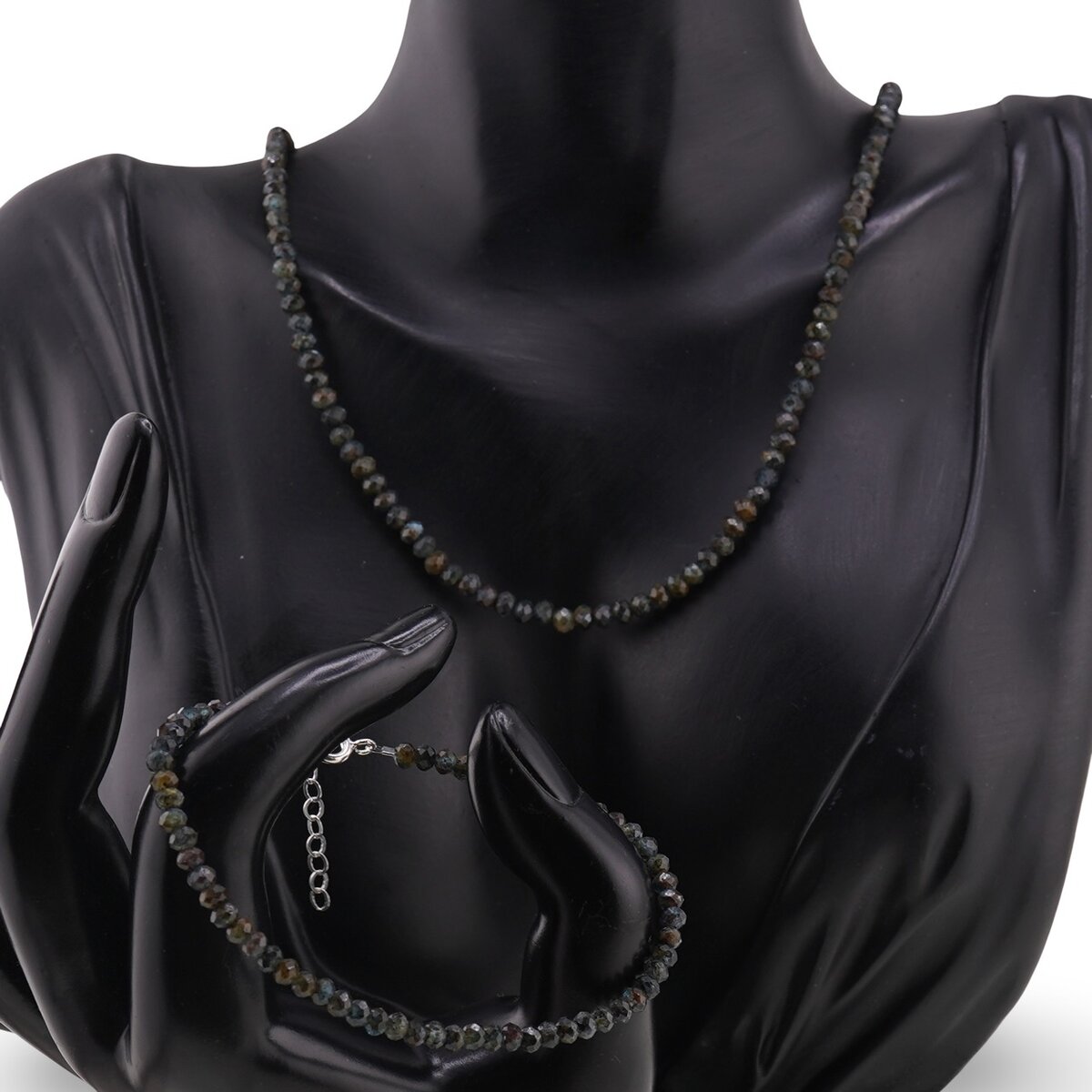 Kianitul albastru prinde viață în acest set de bijuterii creat pentru a te însoți zi de zi, cu o eleganță discretă. Colierul are o lungime lejeră, de aproximativ 43 cm, iar brățara asortată completează firesc ansamblul. Fiecare piesă este realizată din cristal natural, 100%, șlefuit în discuri fațetate de 4 mm, care captează lumina într-un mod plăcut. Elementele de prindere sunt completate de piese metalice din metal comun sau argint 925, pentru un aspect curat și ușor de purtat.
