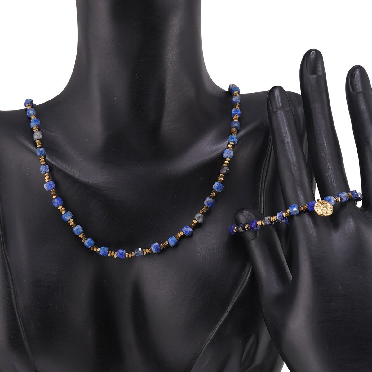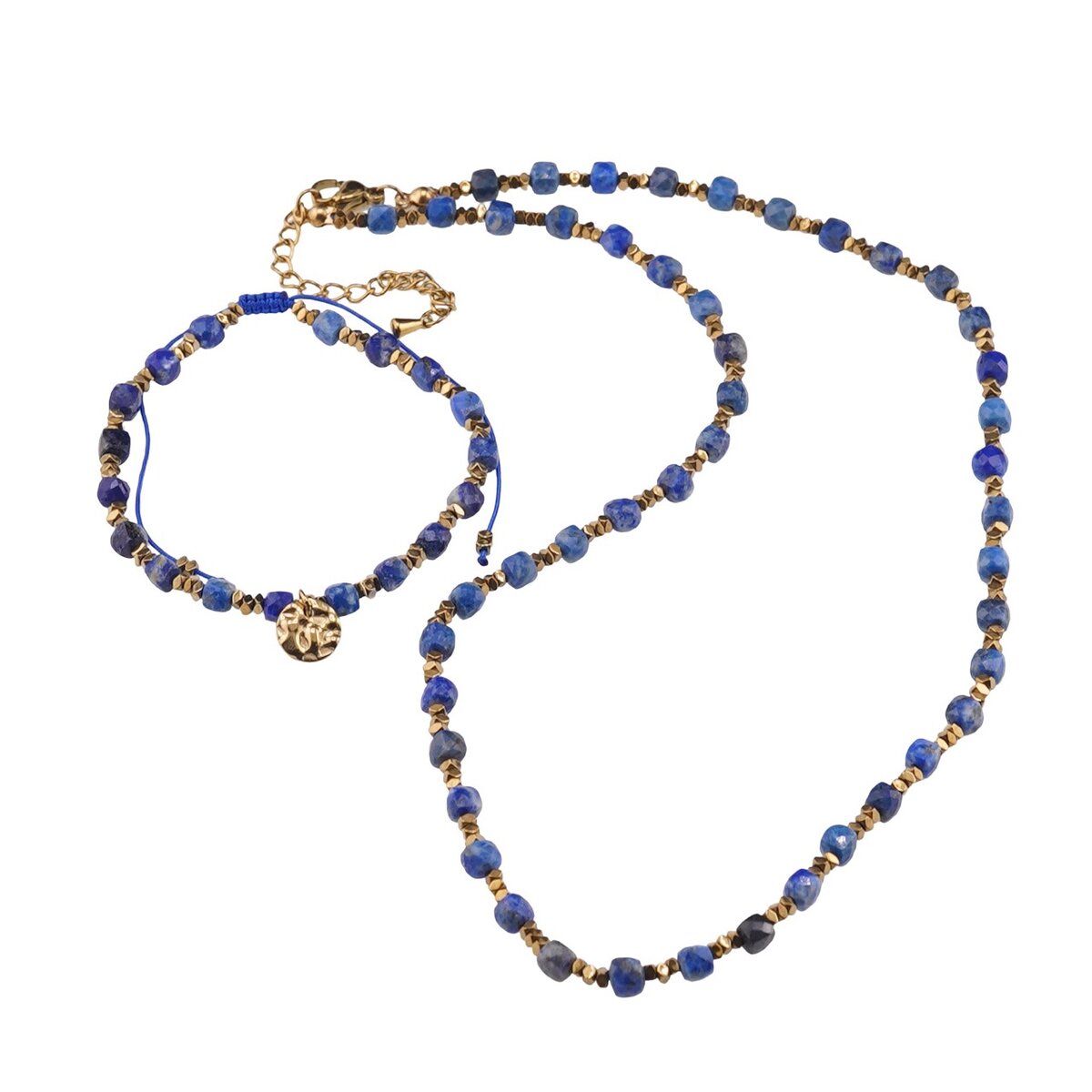 Set bratara si colier Lapis Lazuli cuburi fatetate si Hematit auriu discuri, 2-4mm