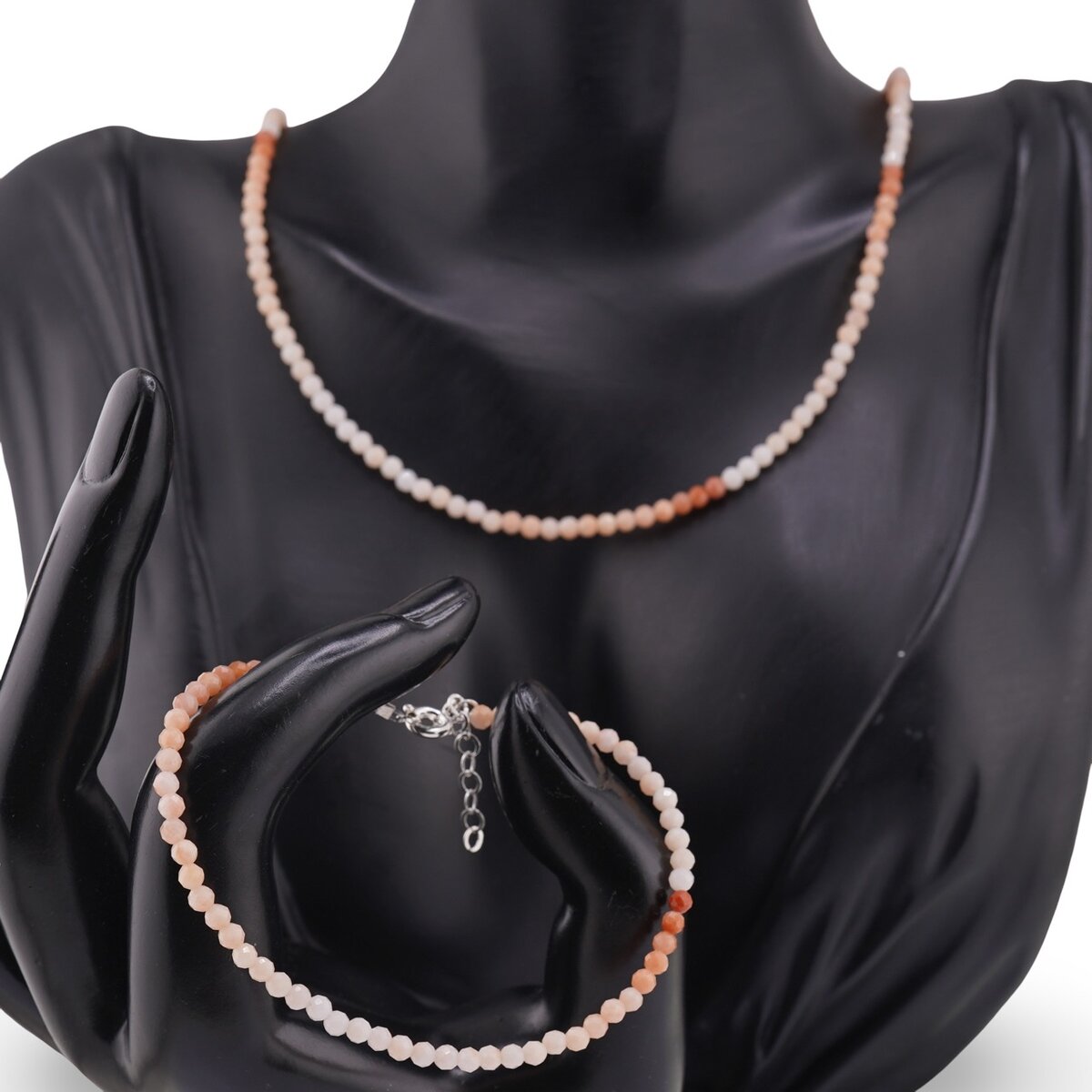 Lasă-te inspirat de luminile calde ale opalului portocaliu în acest set de bijuterii alcătuit din brățară și colier. Fiecare piesă este realizată din cristal natural 100%, șlefuit în sfere fațetate de 3 mm care prind frumos lumina. Colierul, cu o lungime delicată de 43 cm, se așază lejer la baza gâtului, iar brățara completează armonios ținuta de zi sau de seară. Componentele metalice sunt din metal comun sau argint 925, pentru un aspect curat și versatil pe care îl poți integra ușor în stilul tău.