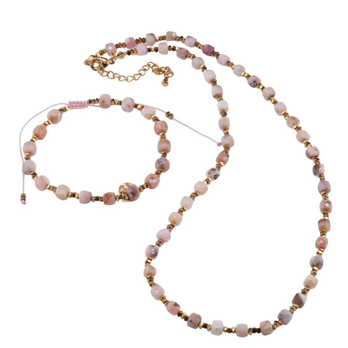 Set bratara si colier Opal roz cuburi fatetate si Hematit auriu discuri, 2-5mm